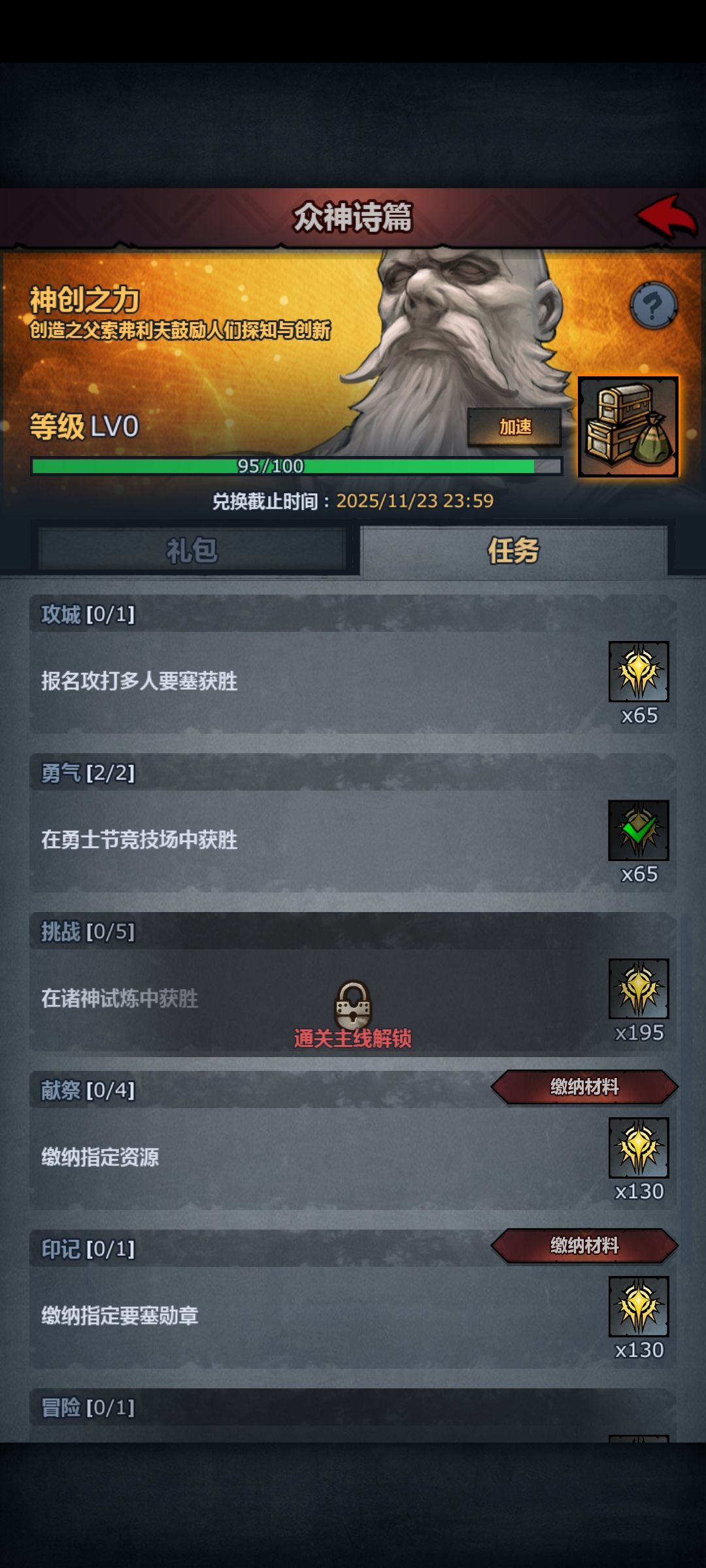 大德没练好的时候日要塞打起来很慢的,全奖好说(副塔拆够主塔的十分之一血就能拿,需要有别人拆掉主塔),可以群里看看有没有好心的老登帮你,建议打要塞征服战活动的要塞,这样第二天能直接领就有活动箱子了可以直接换精金。时间够的话看看众神诗篇要提交的要塞勋章(每周刷新)是什么,自己看着选择。