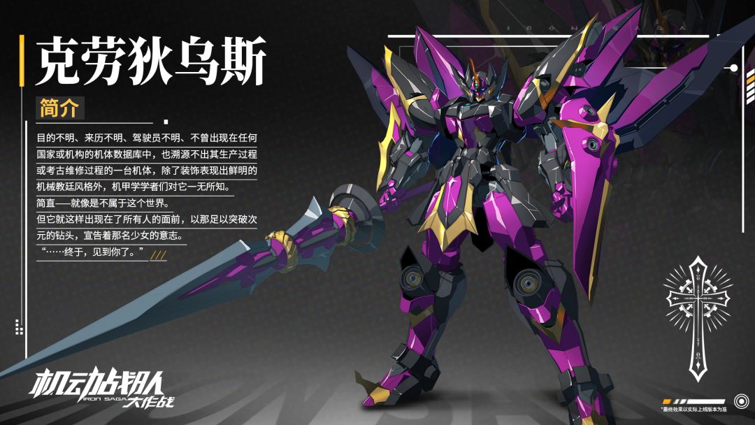 【克劳狄乌斯】:目的不明、来历不明、驾驶员不明、不曾出现在任何国家或机构的机体数据库中,也溯源不出其生产过程或考古维修过程的一台机体,除了装饰表现出鲜明的机械教廷风格外,机甲学学者们对它一无所知。