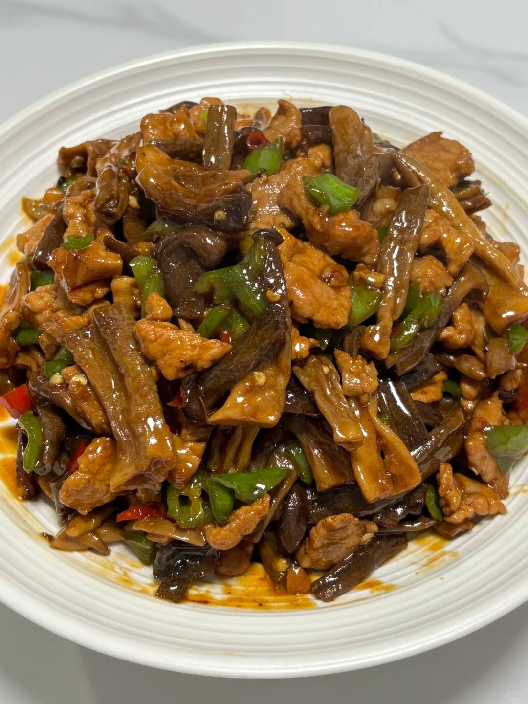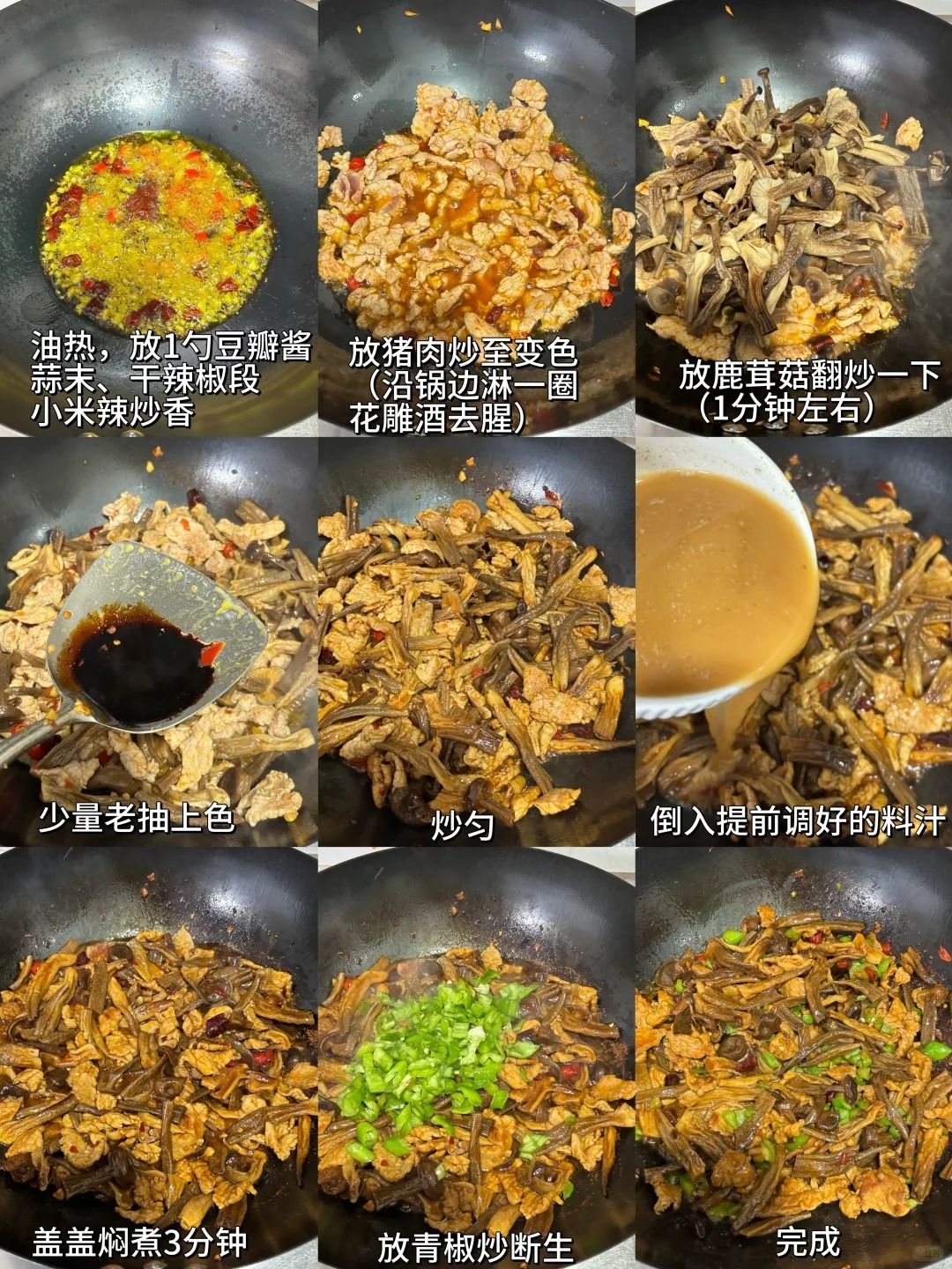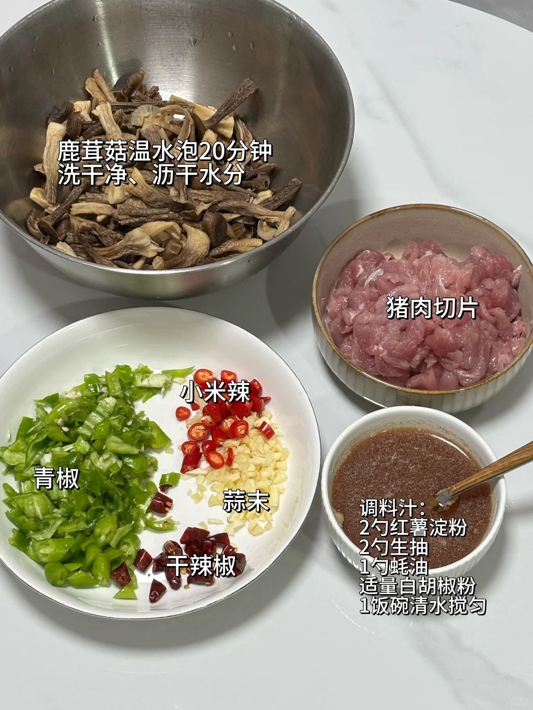 食材🥬:猪肉、干鹿茸菇、蒜末、小米辣、干辣椒、青椒