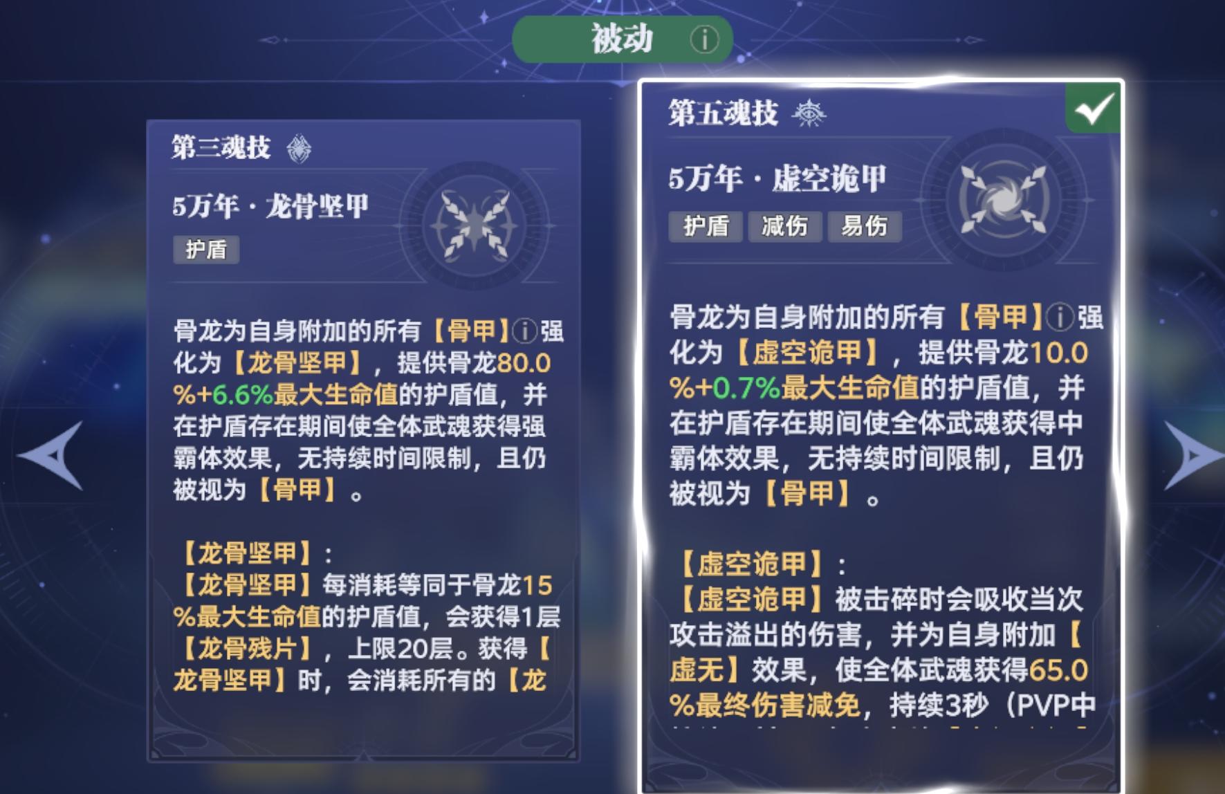 此外是关于骨龙的魂技推荐。PVP推荐456魂技,除强敌外的PVE推荐156魂技,强敌由于容易BOSS的大量伤害导致角色突然死亡推荐123魂技,骨龙123魂技和宁荣荣所提供的护盾值能够全部覆盖生命值,相当于具备两条生命值。一般的PVE携带第六魂技的优点在于能够及时位移到BOSS身边添加蚀骨层数,而第二魂技所需的1.5秒时间着实太长容易浪费输出时间