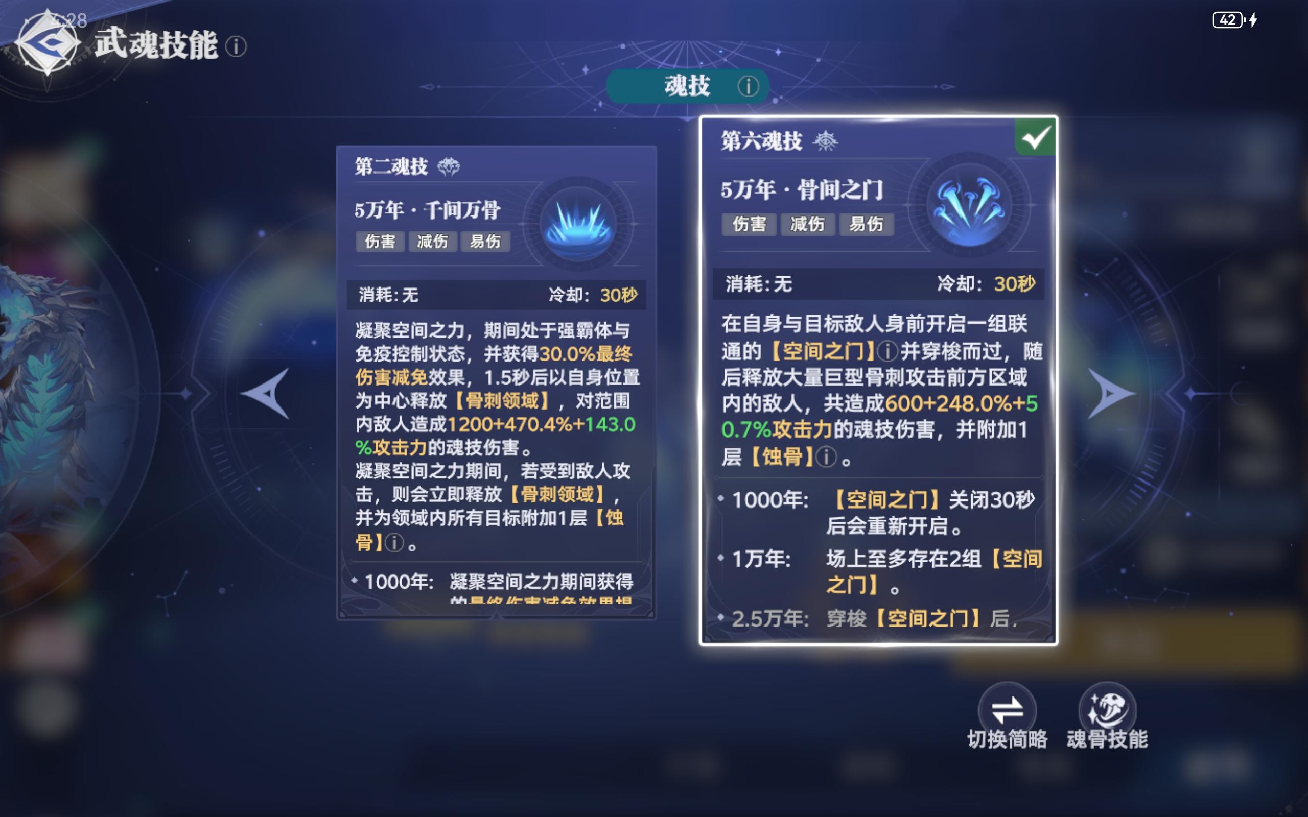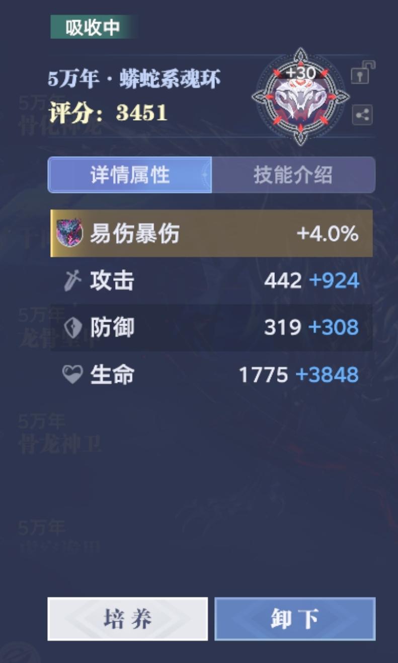 首先是关于该武魂的简短介绍。骨龙是斗罗大陆猎魂世界的首位防御性武魂,其魂技兼具护盾、霸体、减伤、无敌、位移效果,同时具备独一无二的防御增伤能力。武魂羁绊上跟九星七杀剑、邪眸白虎和九宝琉璃塔有关联,这三个武魂的熟练度可以激活一些额外的生命加成、攻击力和精神力。羁绊的属性加成对于防御性骨龙可能不明显,但如果是对于强攻系却是很大的提升。