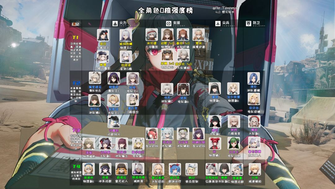 观众老爷们大家好,欢迎收看4.0樱花版本的强度榜,这里是ReTempest。首先是角色的强度变动,这次妮基塔跃键的加强幅度很一般,在满椎强度榜中对比45姐和秋桦这两尊大神还是有不小差距的,梯度排名不变。新角色樱花在伤害贡献和泛用性上面都比刘易斯略低,排在T1.5。