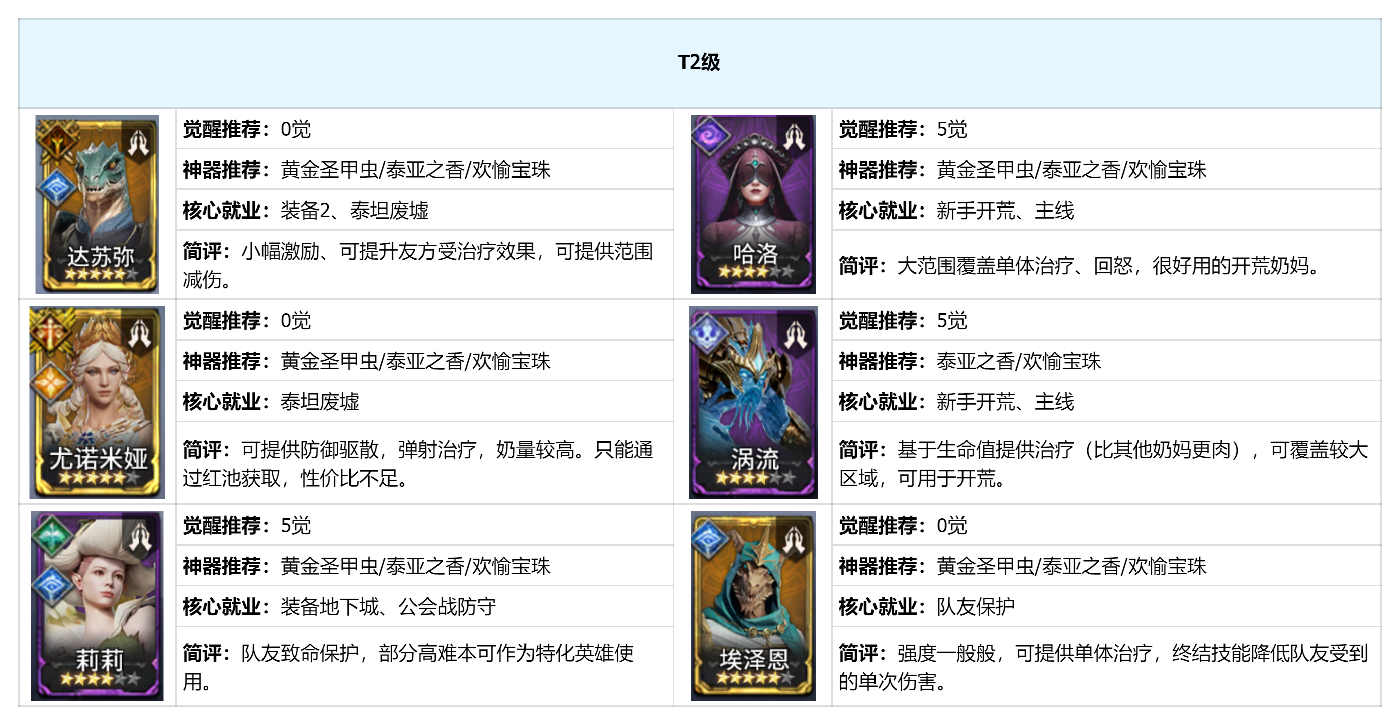 T0榜放了6个英雄略显拥挤,其中貂蝉、艾洛温更值得优先获取(貂蝉是限时英雄,如果有返场可以抽)。萌新玩家可以把德洛丽丝养起来,有60%激励,可大幅降低主线、副本门槛。