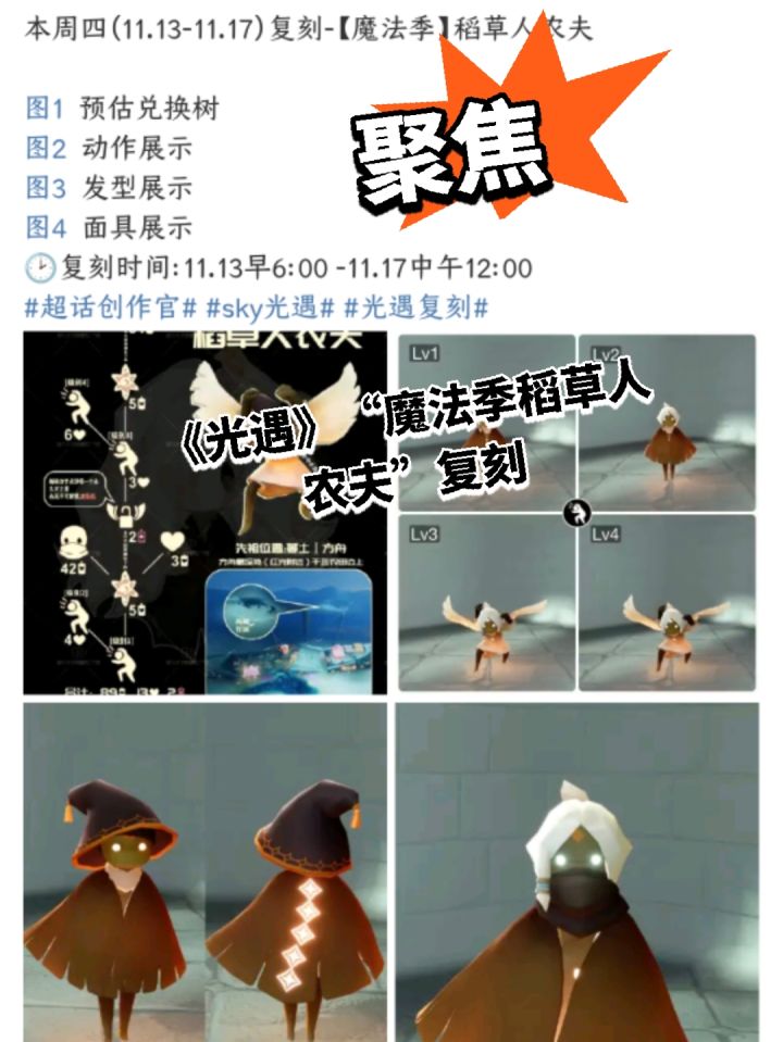 从时间安排来看,此次复刻应该遵循了《光遇》国服的标准复刻周期,玩家需注意活动仅持续四天,错过后可能需要再等待相当长的时间才能再次遇到。稻草人农夫先祖将带来一系列充满魔法季特色的道具。其中包括带有巫师帽风格的发型、神秘黑色面具以及棕色斗篷,整套装扮洋溢着浓郁的魔法氛围。