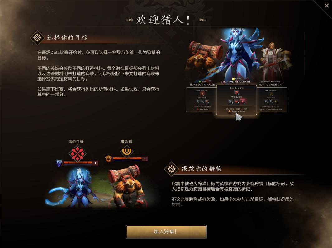 免费福利:六套狩猎套装+艾露猫信使,零门槛体验怪猎美学联动活动以“英雄狩猎”为核心玩法,玩家需要通过在游戏对局内击杀敌对英雄来获取打造材料,不同英雄会奖励不同的打造材料,每个潜在目标都会列出材料以及这些材料用来打造的套装,对局获胜会获得所有列出的材料,失败则只会获得一部分,玩家通过游玩即可收集六套《怪物猎人》经典铠甲的DOTA2版本。