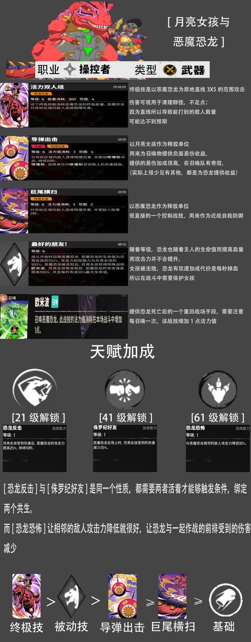 月亮女孩与恶魔恐龙在召唤流里是首C位,不对其他召唤英雄进行配队也能与其他阵容进行组队,可以说一女一龙的组合默契十足。