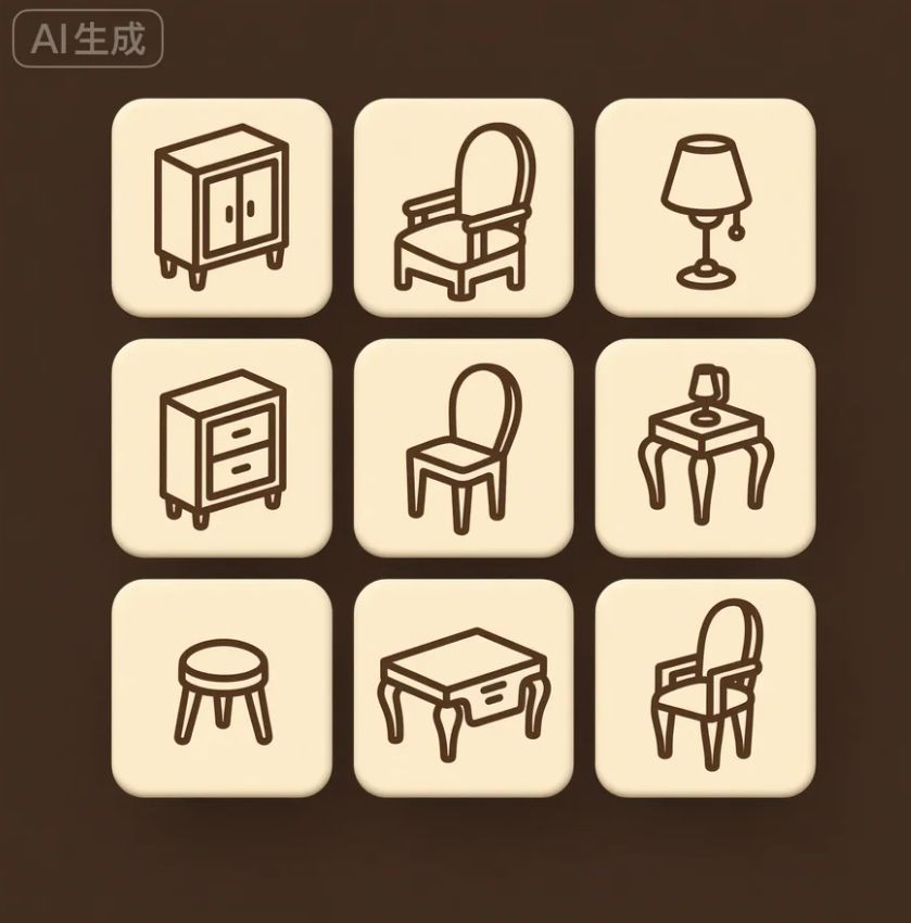 简笔画2d抽象派画家矢量,卡通极简线条感logoicon设计,棕色系,9宫格等距排列分布,设计icon有:柜子,欧式凳子,椅子,桌子,台灯,顶灯,弹背景为浅米黄色纯色背景,无额外背景元素,颗粒质感清晰感,高清细节、8K 画质