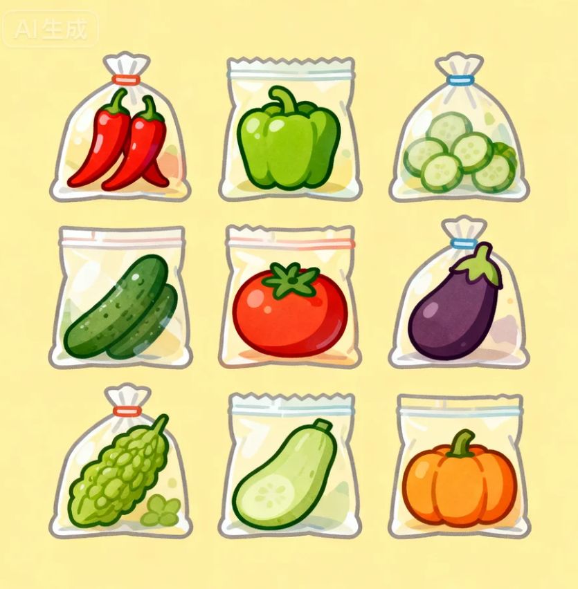 日式萌系画风,手绘插画,简约可爱2d卡通游戏图标设计,9宫格图片展示,9种塑料包装的商品设计,一包装有辣椒的商品袋,一包装有青椒的商品袋,一包装有黄瓜的商品袋,一包装有番茄的商品袋,一包装有茄子的商品袋,一包装有苦瓜的商品袋,一包装有冬瓜的商品袋,一包装有南瓜的商品袋,浅黄色背景,萌系可爱,色彩柔和清新,简约风格,治愈系列,手绘插画,q版简约造型