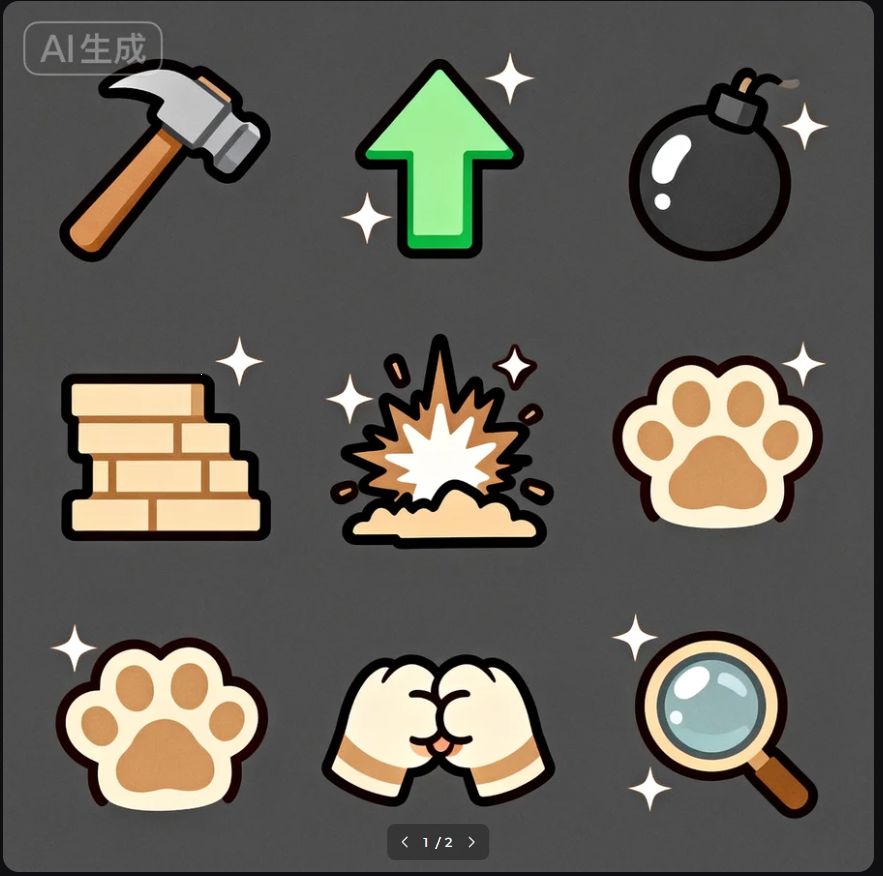 技巧4:ai绘画生成时,尽量使用同一比例产出资源,依旧使用宫格布局,这样抠图后,切图就可以快速使用,不用再一个个调整图标的大小。1:1和9:16的比例产出的图,抠图时比例不同,你还要额外再去切图以及调整大小,很烦的……