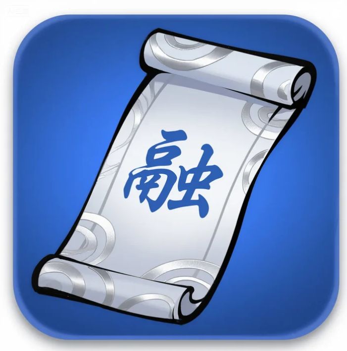 中国风修仙二次元游戏图标设计,正视角,一张蓝月底色道家符纸,上面有银色纹路,写着一个同色系的“融”字,边缘平直的纸张,精品2d国风icon,道具描边黑色墨笔描边,纯白色的背景,四周大面积留白,无任何装饰