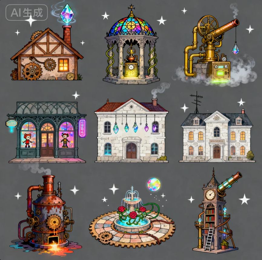 民居建筑:倾斜的木质桁架结构与发条齿轮咬合,烟囱口悬浮着稳定旋转的魔法水晶,窗户像老式仪表盘般闪烁暖光。