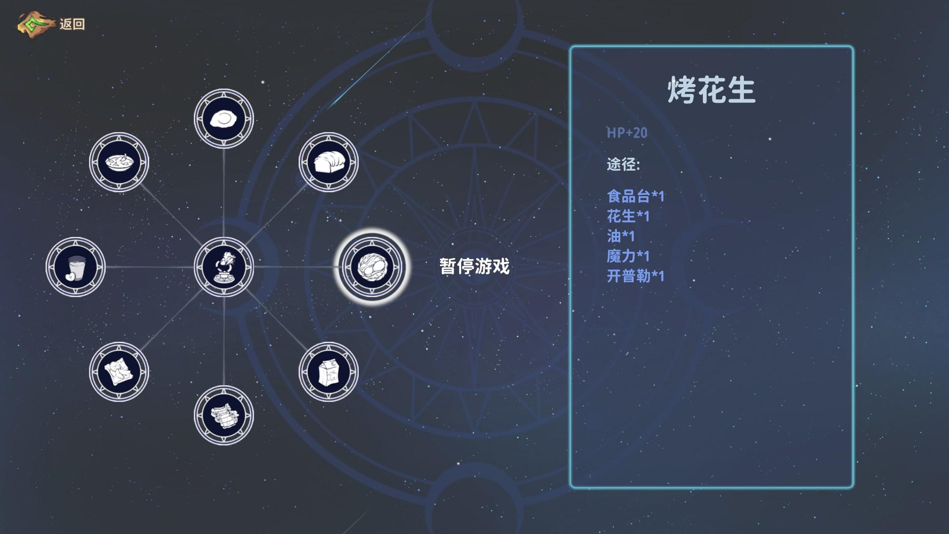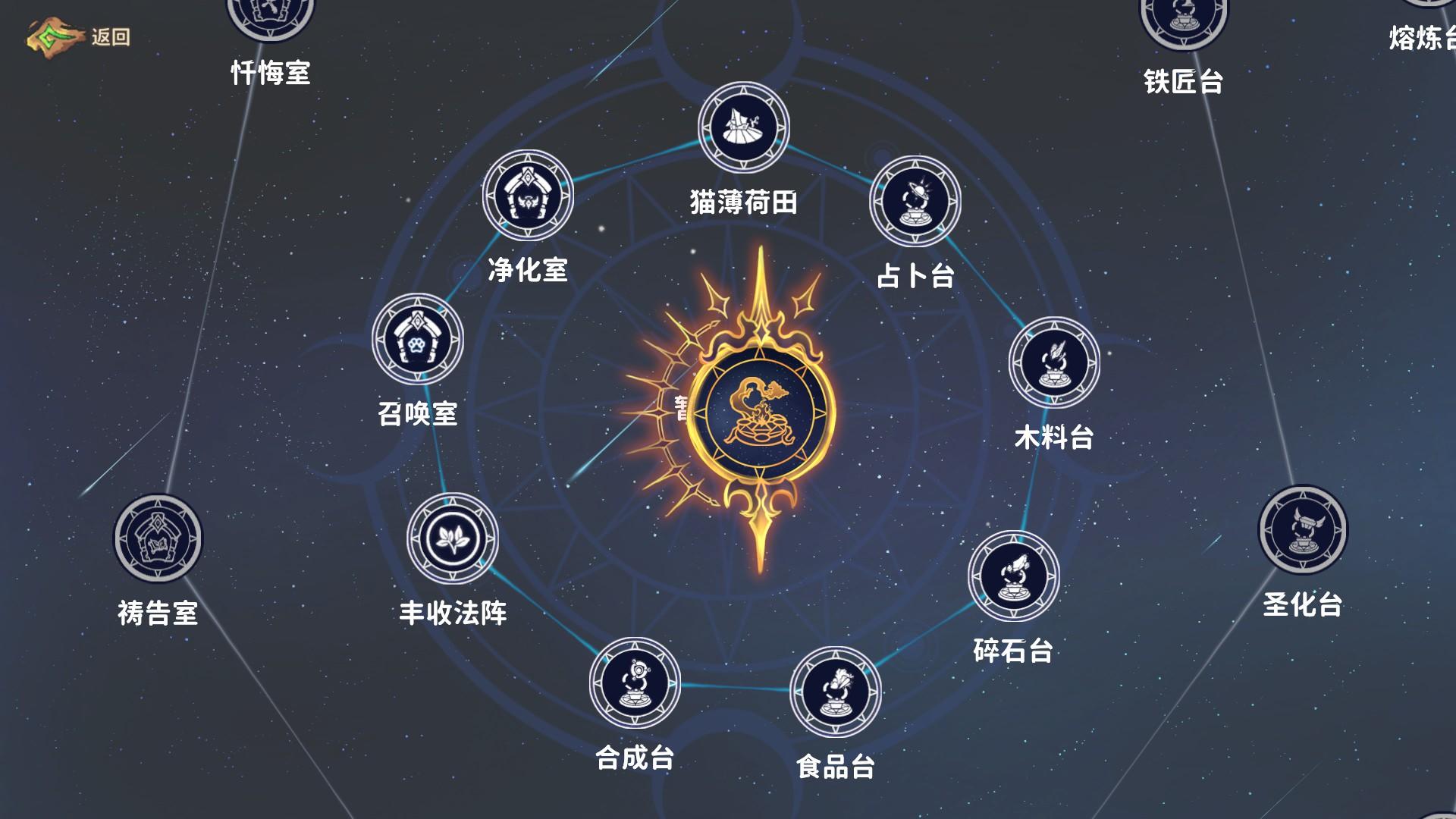 通过点击星图中的建筑来显示其能制造的配方,而配方需要通过灵感和建筑卡交互才能解锁,灵感来自占卜台,可以使用灵感在建筑卡上去解锁新配方,解锁失败也会给予其他材料补偿。猫族特有的法阵,可以连接至单位卡或建筑卡上,提供增益效果,比如丰收法阵连接猫薄荷田,注意一个法阵只能对应连接一张卡牌提供增益。