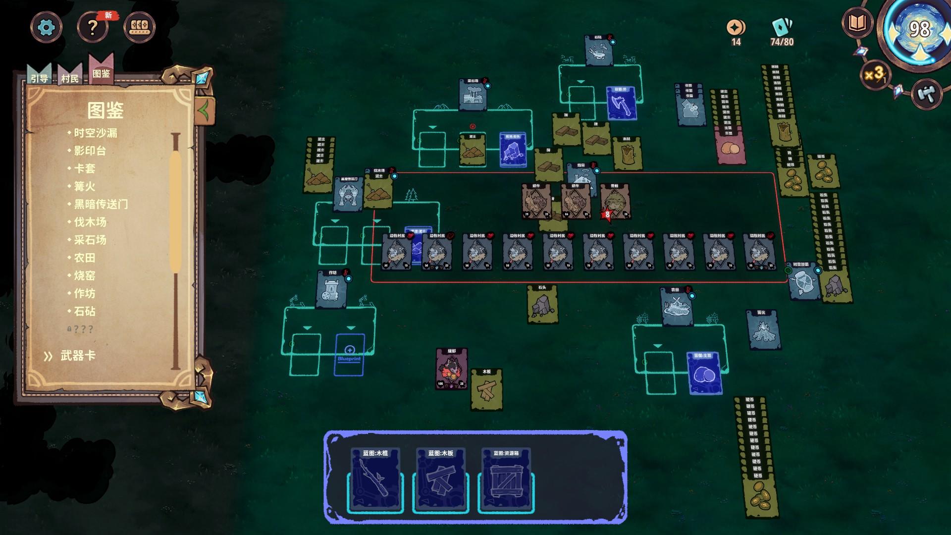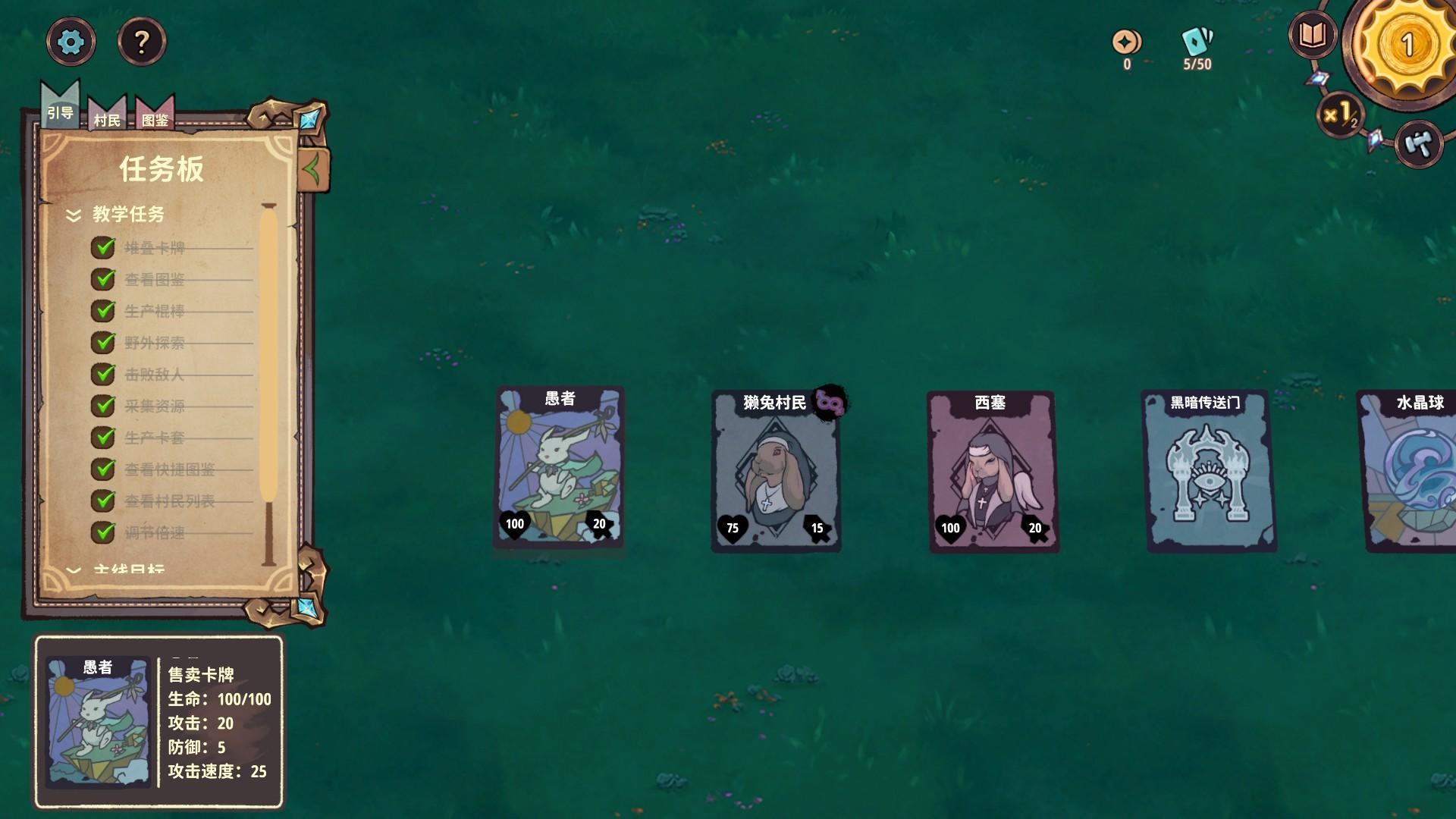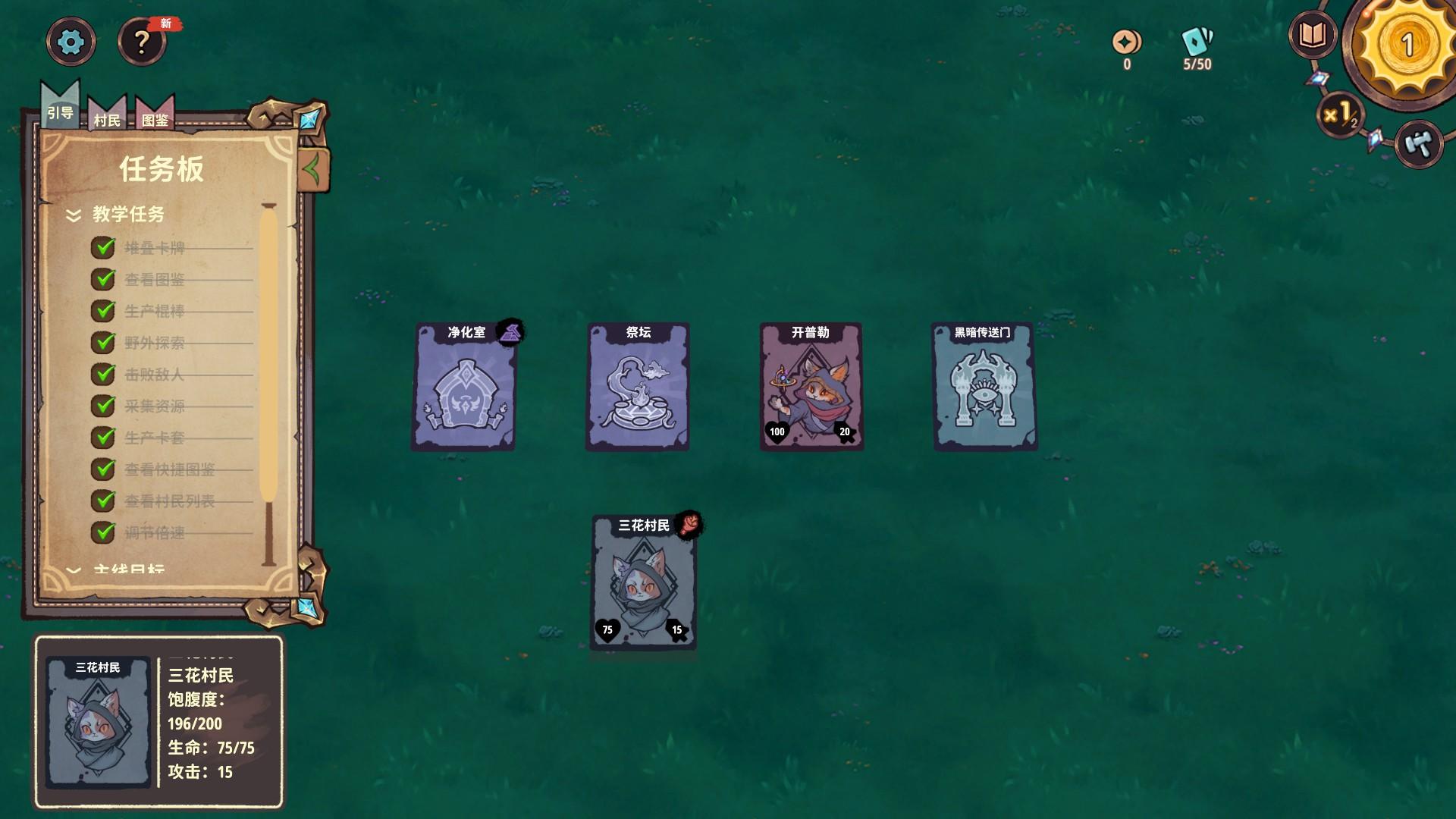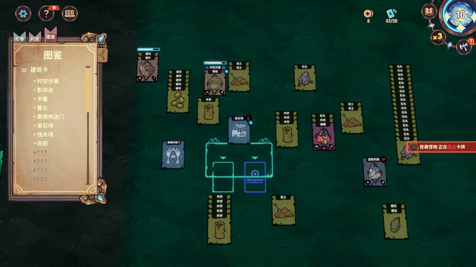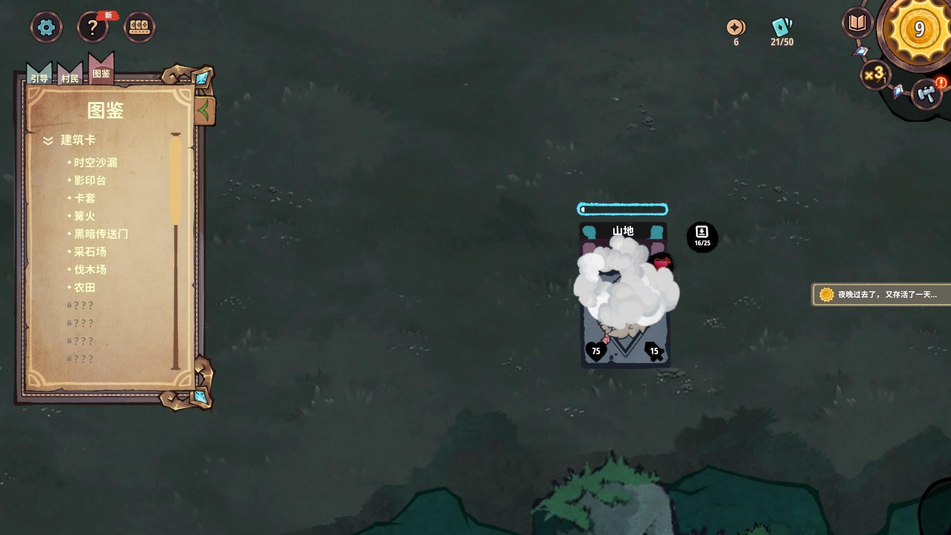 野外采集会比直接生产更快,而单位卡右侧还会出现负重图标来表示你能采集多少从野外携带回去,注意会自动将采集的所有卡牌卸载到你移动单位卡到彩色地块的终点位置。昼夜轮转自动流逝的时间,黑夜来临会随机出现敌人,而敌人目标是摧毁你的黑暗传送门,所以你需要注意在保证英雄不死的前提下,你还需要进行战斗,去守卫你的黑暗传送门,这张卡牌可以销毁除剧情卡外的一切卡牌。