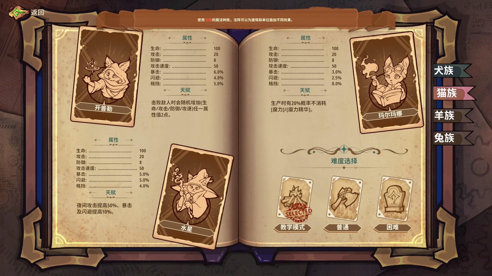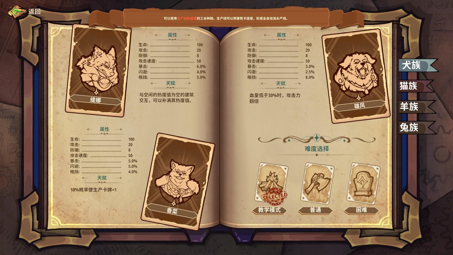 比较独特的是游戏中有着四个动物种族,每个种族都有着详细的教程关卡,前面基本一致,在后面对于科技树和建筑卡的使用上却有完全不同的诠释,具体后面再说,之后的内容会包含游戏教程机制,看完后可以快速上手跳过教程直接从普通难度开始体验,大家也可以随时从游戏帮助中回顾教程部分。