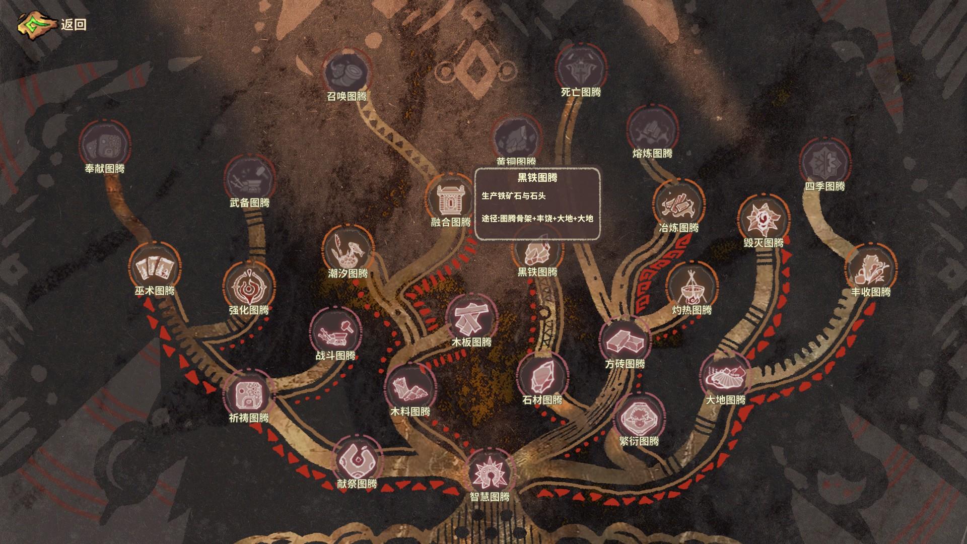 羊族的科技树是树状分支,是通过图腾图案和图腾骨架组合出一个新建筑来点亮节点的,可以通过在科技树点击节点来查看配方,羊族的配方需要通过启示和图腾建筑卡交互才可以解锁,,启示卡来自和智慧图腾交互,生产出启示放置在图腾建筑卡上,有概率解锁新配方,解锁失败产出不定量其他资源作为补偿。