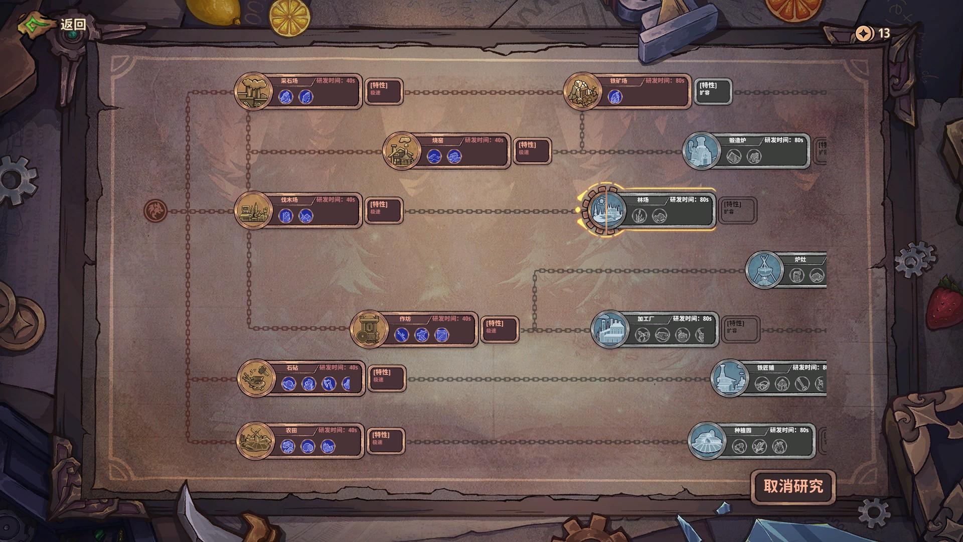 猫族单位卡右上角会出现饱腹值,一样是生产交互时降低,不过归零后依旧可以工作战斗只是效率减半。食品卡可恢复,但产出食品卡的建筑卡,需要猫族灵感启发新配方后才能生产。是的猫族的科技树和犬族的工业主题不同,是星图法阵的设定,通过祭坛、仪式所、教堂控制的主基地进行进化,每次主基地进化完成,新的一圈科技树会自动解锁。