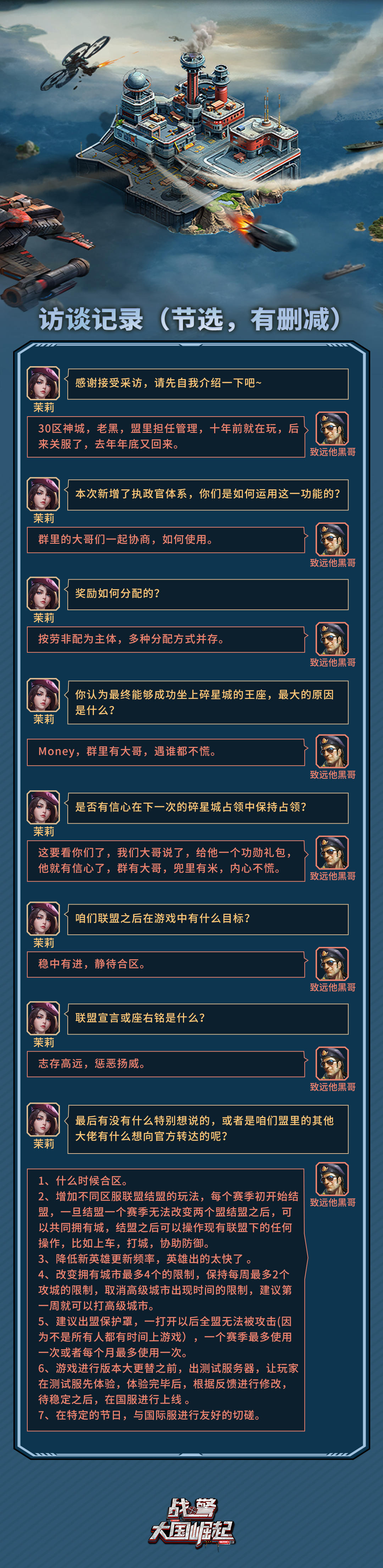碎星城战火暂熄,30区【神城】以一派举重若轻之姿,稳坐王座。今天我们特邀联盟管理——致远他黑哥,走进这个“幽默其外,实力其中”的联盟,聆听他们谈笑间攻下碎星城的幕后故事。