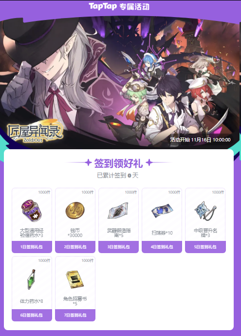 《匠屋异闻录》十一月下签到活动上线!累签领角色招募书~