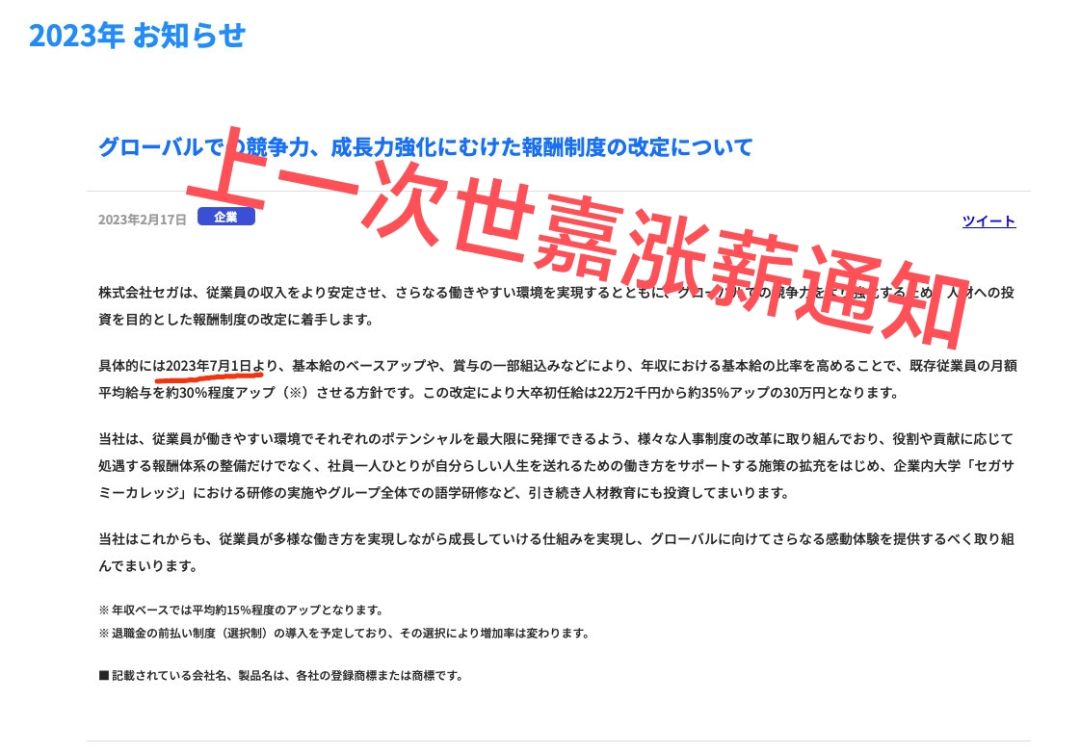 世嘉上一次涨薪是从2023年7月1日起,员工的“平均月工资”将上涨约30%,大学生则增加35%。