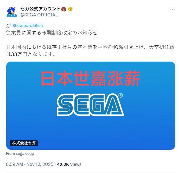 11/12号,世嘉官方发布涨薪通知,2026年4月1号起其国内现有正式员工的“基本工资”平均上调约10%❗❗❗