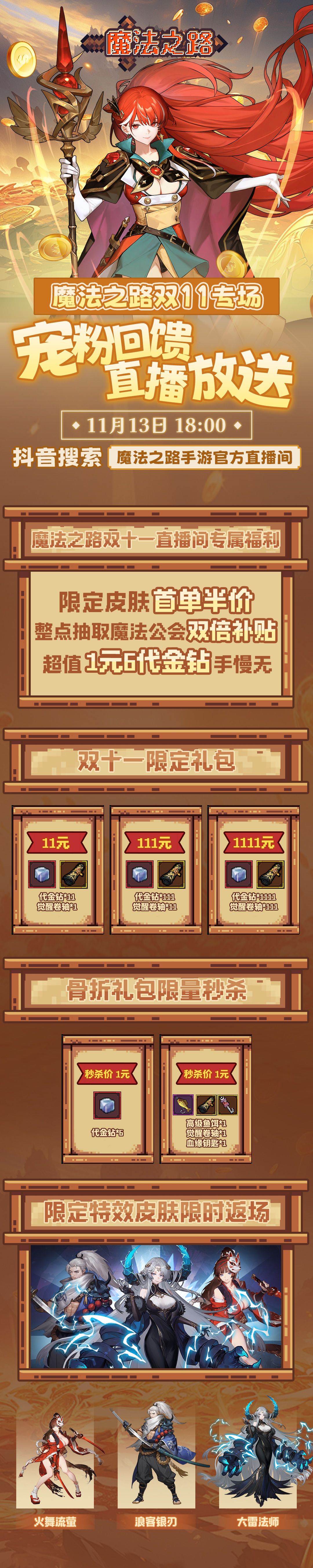 骨折礼包,半价皮肤,1元6钻!尽在魔法之路宠粉直播专场
