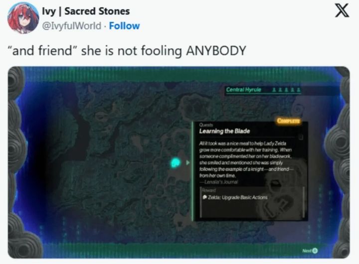 近日,《塞尔达无双:封印战纪》英文版中一则任务的描述引发玩家关注,塞尔达公主在日记中将林克称为“一位来自同时代的骑士也是朋友”,这一表述与日文原版存在差异,加之系列此前作品对二人关系的刻画,迅速在玩家社群中掀起了广泛讨论,部分玩家认为英文翻译有意“淡化浪漫”,另一部分则视其为角色关系的合理诠释,怎么说吧,感觉任天堂并不想强行把塞尔达和林克绑定为情侣,塞尔达与林克保持为朋友这一有想象空间的关系,可能更符合作品需要吧![[TapTap表情|TapFamilyxdoro2_粉狗比心]](https://img-tc.tapimg.com/market/images/101c7e3200596fe8e03765080b467fb8.gif)