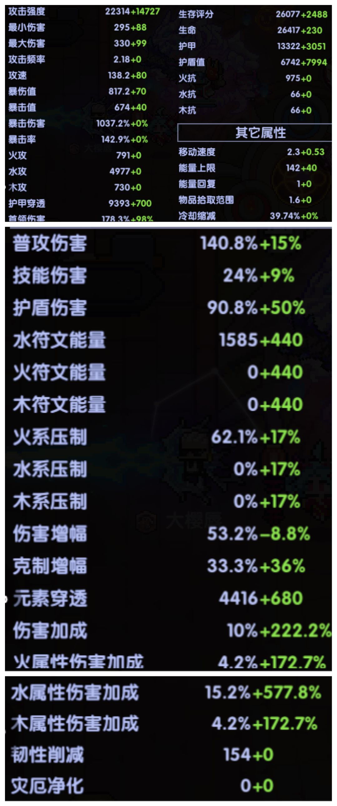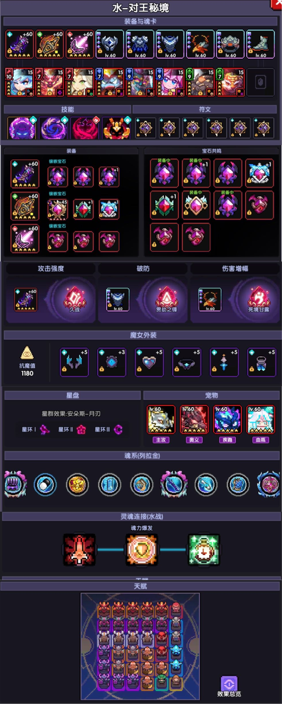 对大秘境的稀有属性进行了解,如:属性压制、伤害增幅、克制增幅、护盾伤害、首领伤害、普攻伤害、技能伤害、全伤、属性伤害加成等。最后就是不同层级下大秘境BUFF不同对全伤以及属性伤害加成的稀释进行分析。面板的调试就需要我们满足这些方面的要求,因此大家在挑战对应的魔王秘境时需要按需配置。(狼魂和小闹福的降低的护穿井不能计入我们的面板当中,只有他们的元穿和蛇的元穿可以计入我们的面板中)