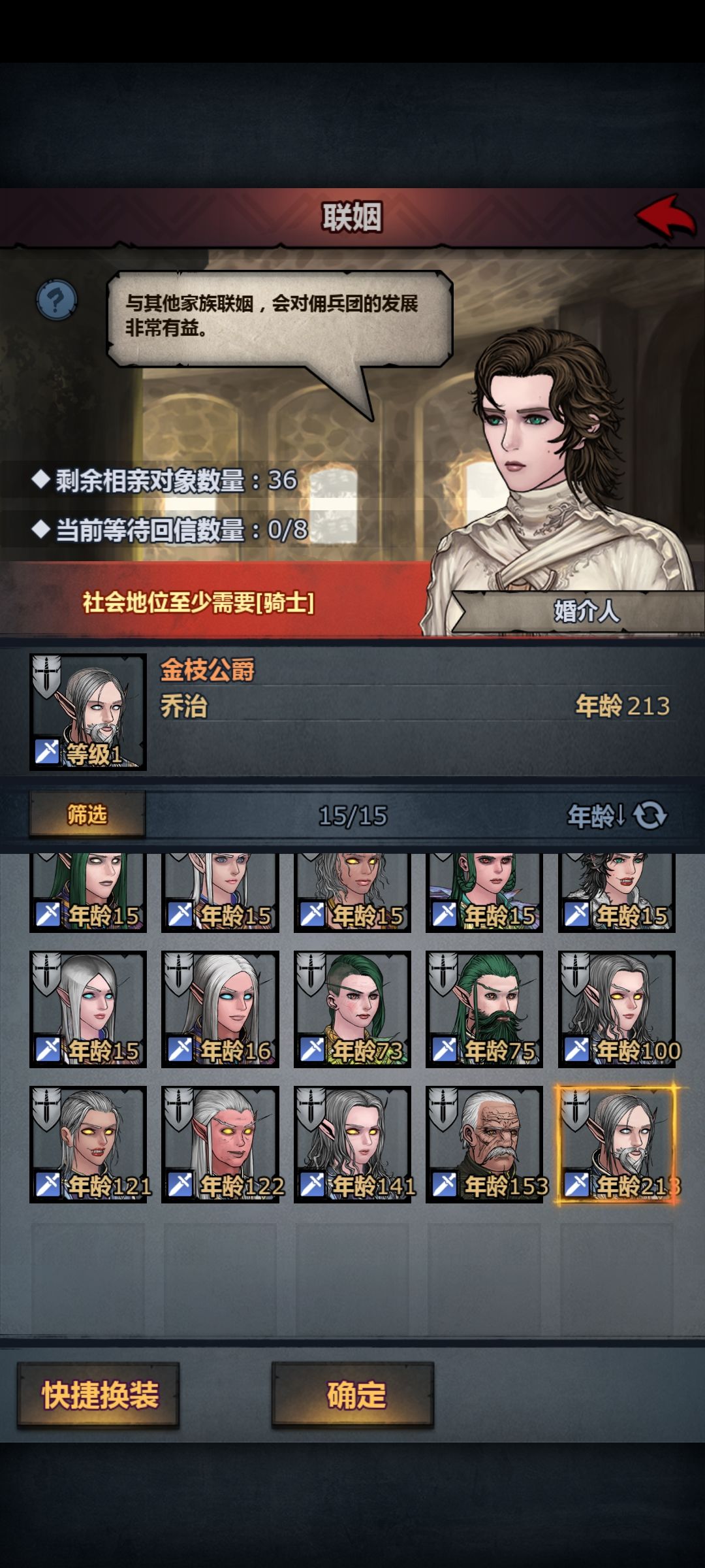 有大佬测试过,关于很多想让某些角色早点死刷伤好让后边继承爵位的,行不通,死亡才能继承爵位,伤疤只影响退休年龄。不在队伍里的才会加快死亡。所以后期想让活的长的上自专骑士继承爵位,把前边的和父母看着解雇就行,继承公爵后年龄大了开宴会给结婚。