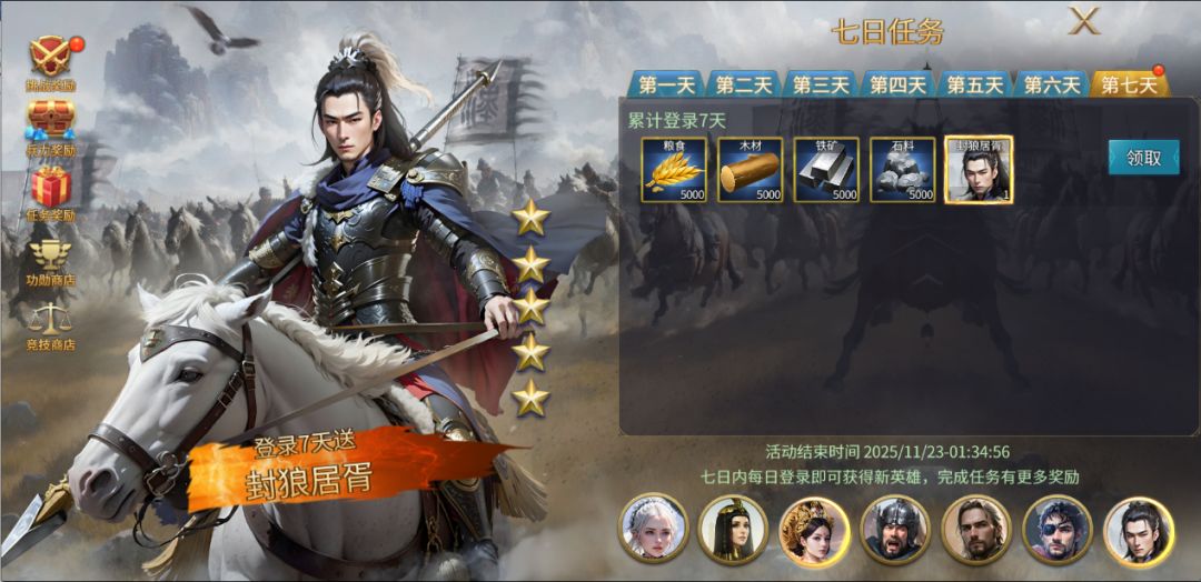 2.开服七日活动第七天,可以获得:封狼居胥-霍去病,尖刀阵的核心五星英雄;