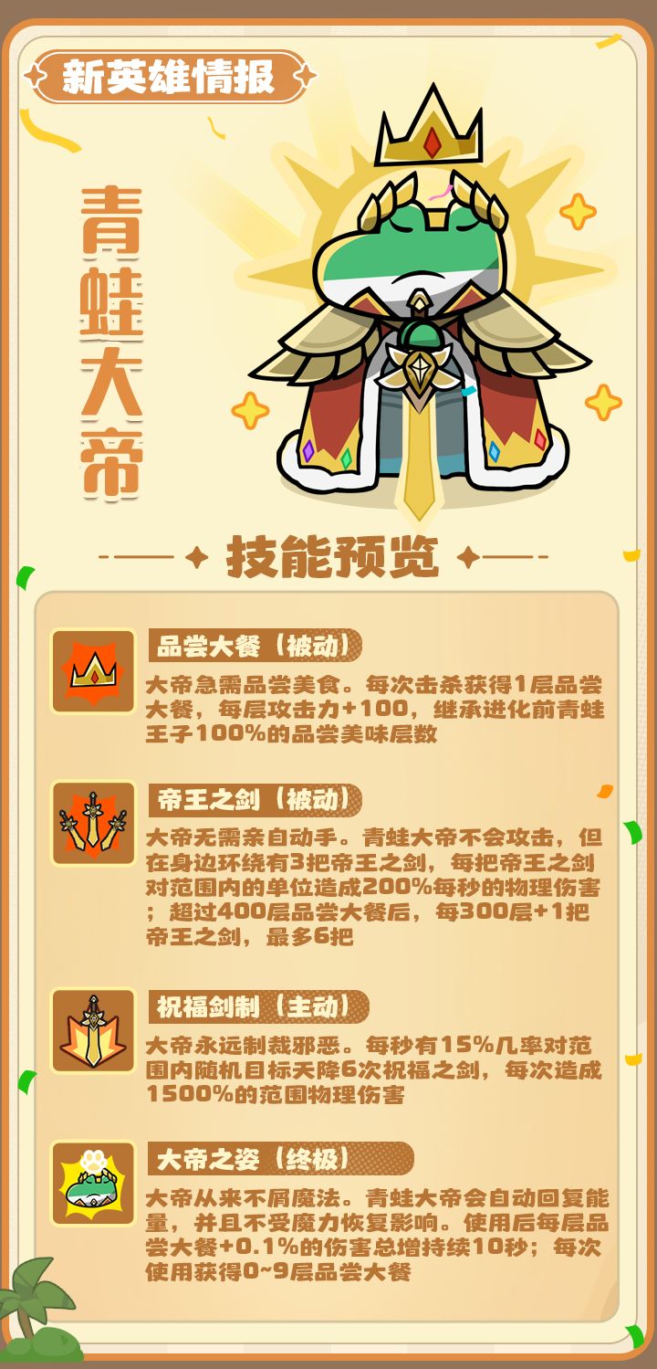 作为首个【不朽】品质英雄,【青蛙大帝】在保留青蛙王子品尝美味和祝福之剑特色的同时变得更加强大,也有了全新的技能和攻击效果。