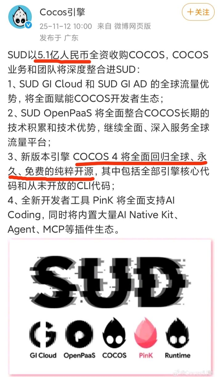 11月12号,游戏引擎Cocos发文宣布,忽然科技(SUD)以5.1亿RMB全资收购Cocos,其业务和团队将深度整合进SUD。