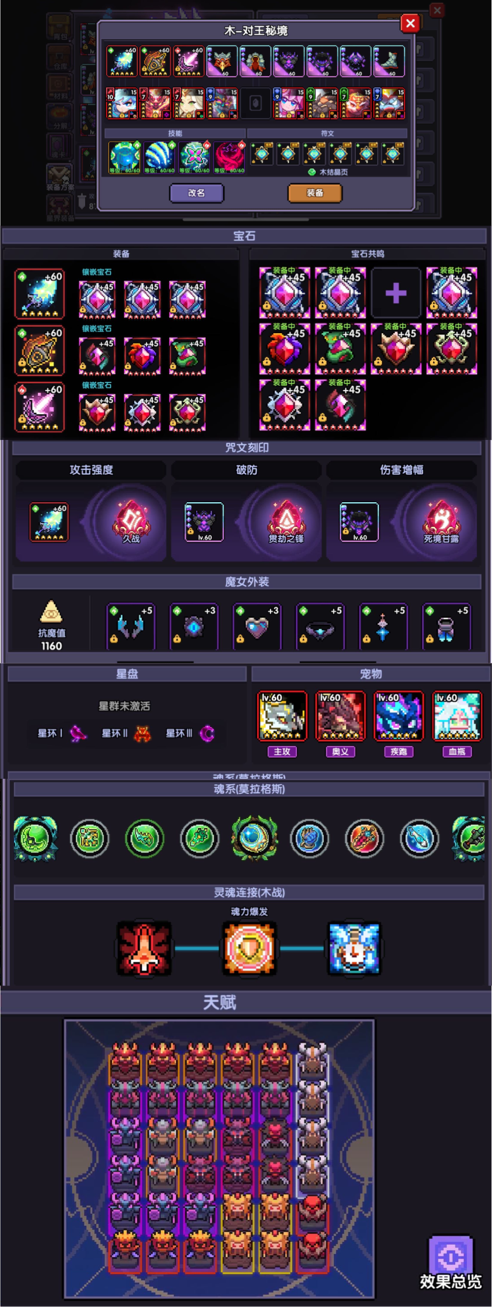 武器与暗金装备、宝石、魂书、魂卡羁绊与效果、星盘、宠物(奥义宠物等级以及部分