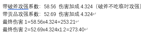 在破斧和贡品二者中我们携带的技能为贡品,因为破斧只增强基础攻强,对临时攻强并未加成。