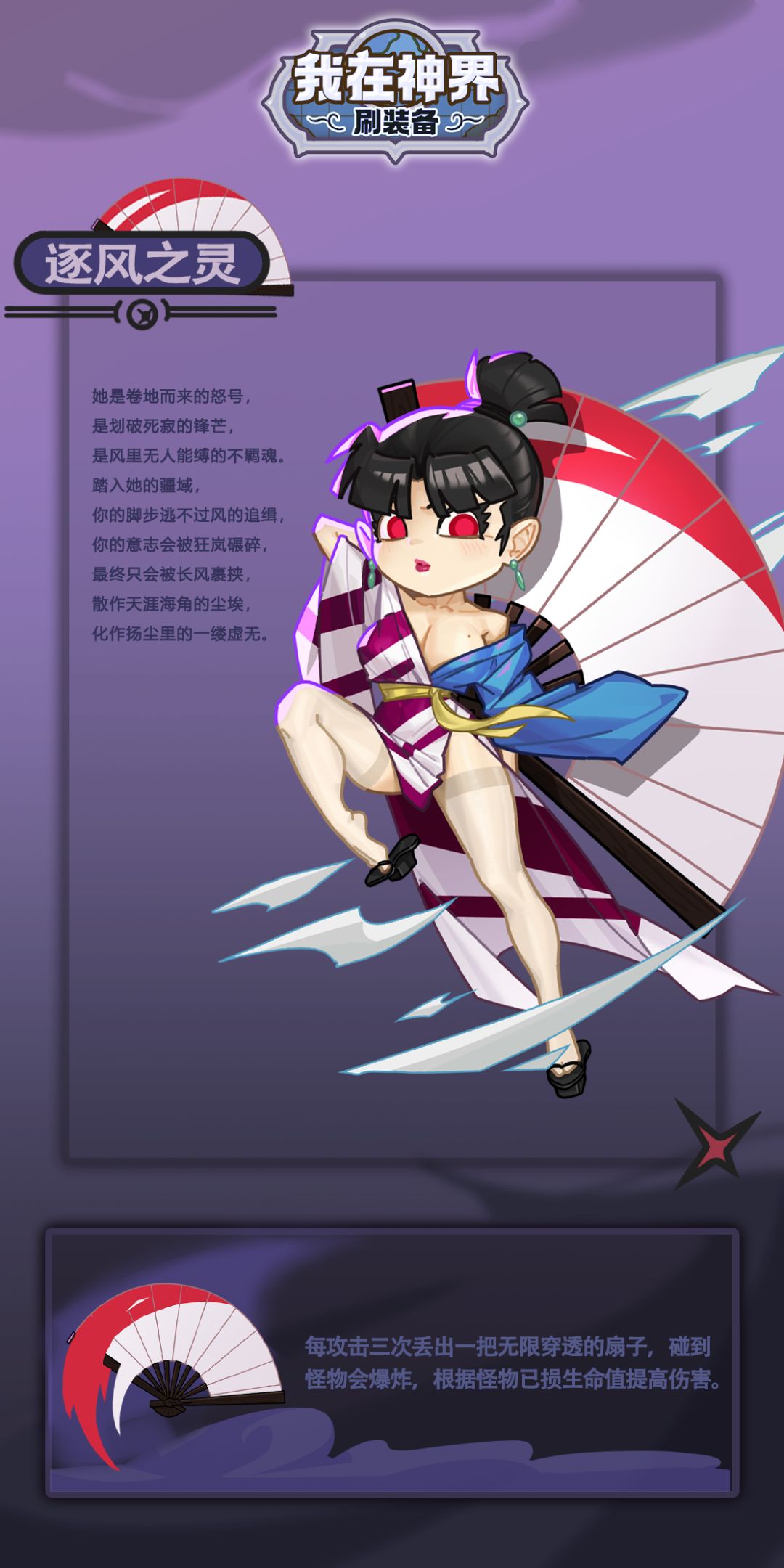 皮肤效果预览:新增攻击方式-折扇,每攻击3次,触发一个缓慢飞行的折扇,持续牵引周围怪物,击中怪物后爆炸。皮肤星级提升后,提高风系英雄伤害与全体英雄暴击伤害,提升折扇范围,并且折扇爆炸会根据怪物已损生命值提高伤害,最多提升至八倍。