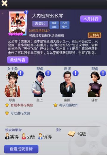 2:确认好剧本是5人本以后,根据自身已有的艺人,进行上阵最佳阵容,如果自己的一套阵型是完全可以上阵的,基本可以成为神本,有完美饰演更好,如果一个剧本您自己一套阵型只能上3个或者4个?需要勉强去用其他不适应的艺人去硬凑,那么这种剧本也是基本可以放弃掉的。类似以下剧本就可以成为神本级别,仅供参考,类似的其他神本大家也可以自行挖掘哦~