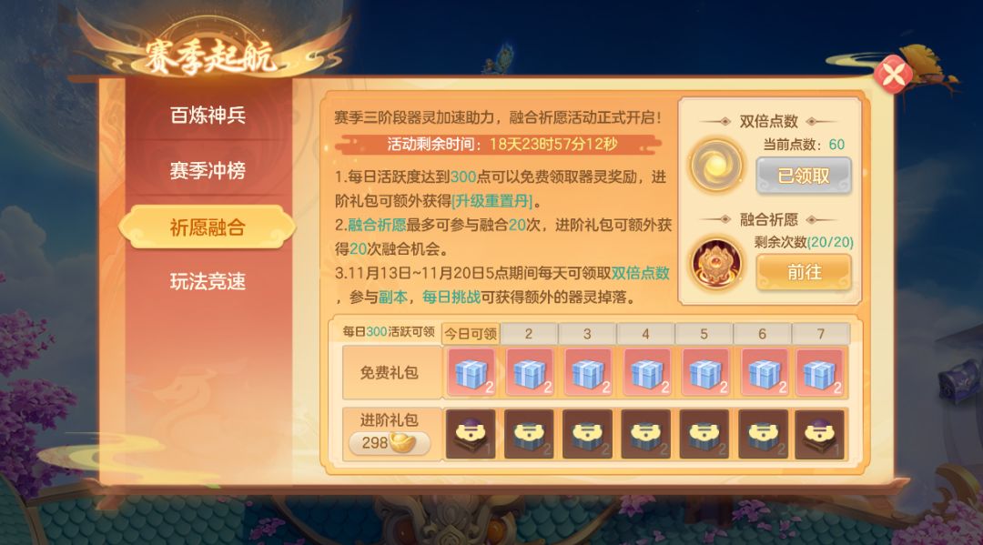 (1)器灵融合祈愿活动正式开启,可使用一定数量的绝品器灵进行许愿融合,可从赛季启航界面参与活动