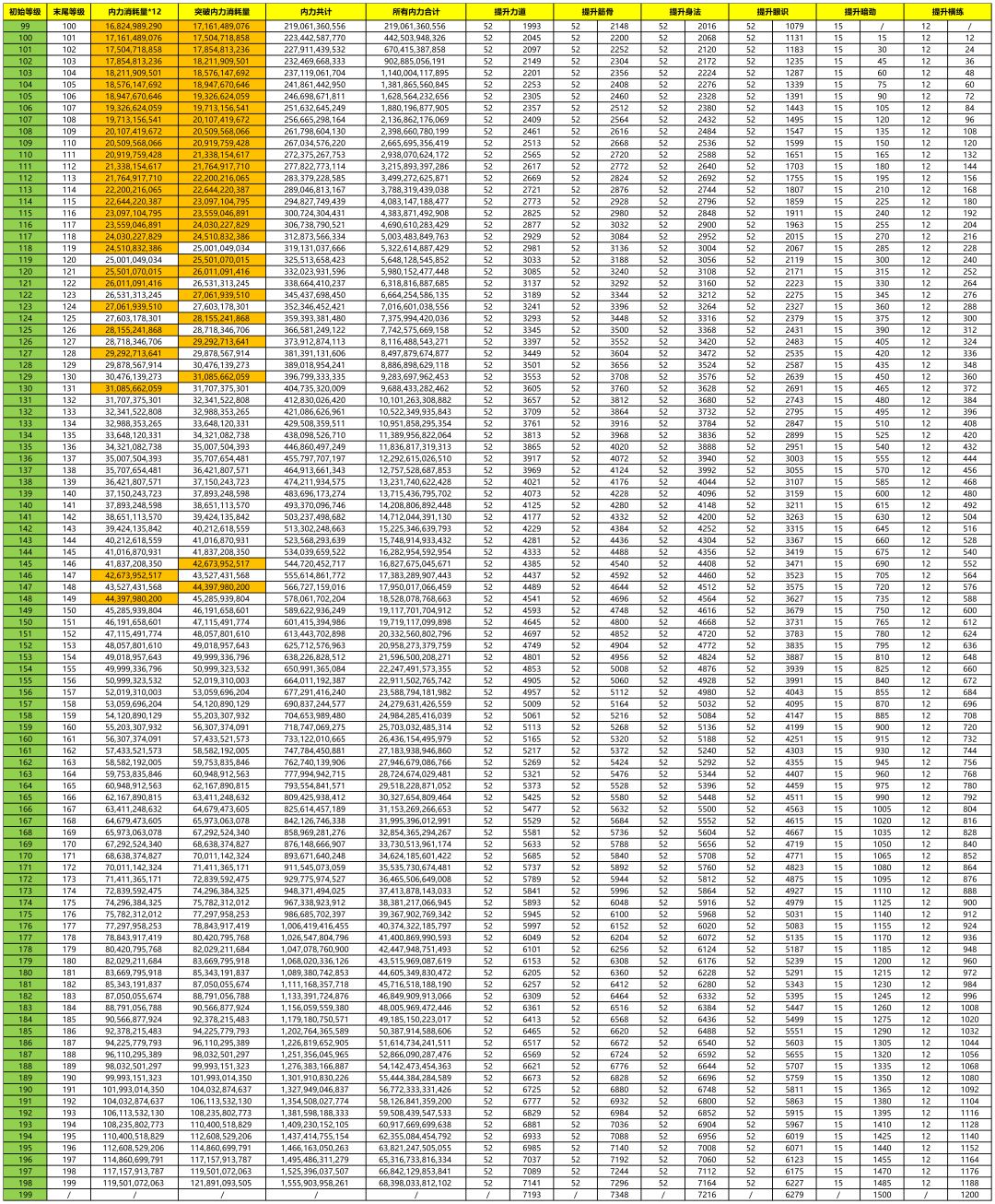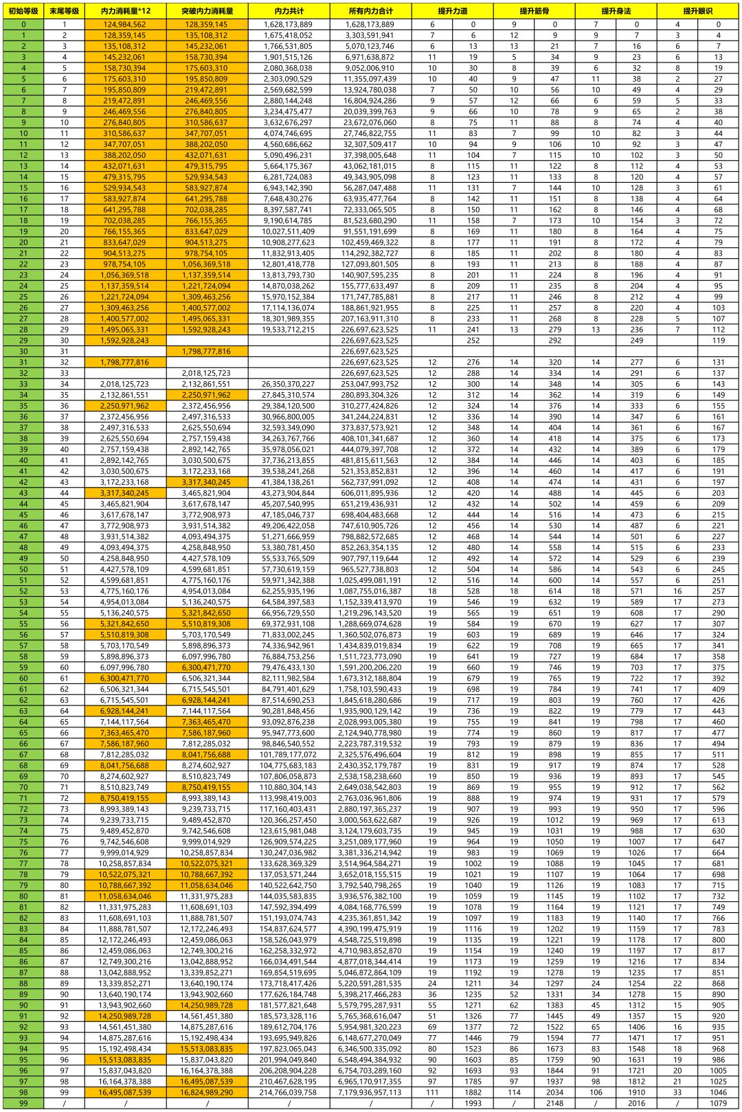 注:缺少30级的内力和属性以及32级的内力,如果有的话可以补充下(标橙已确定)