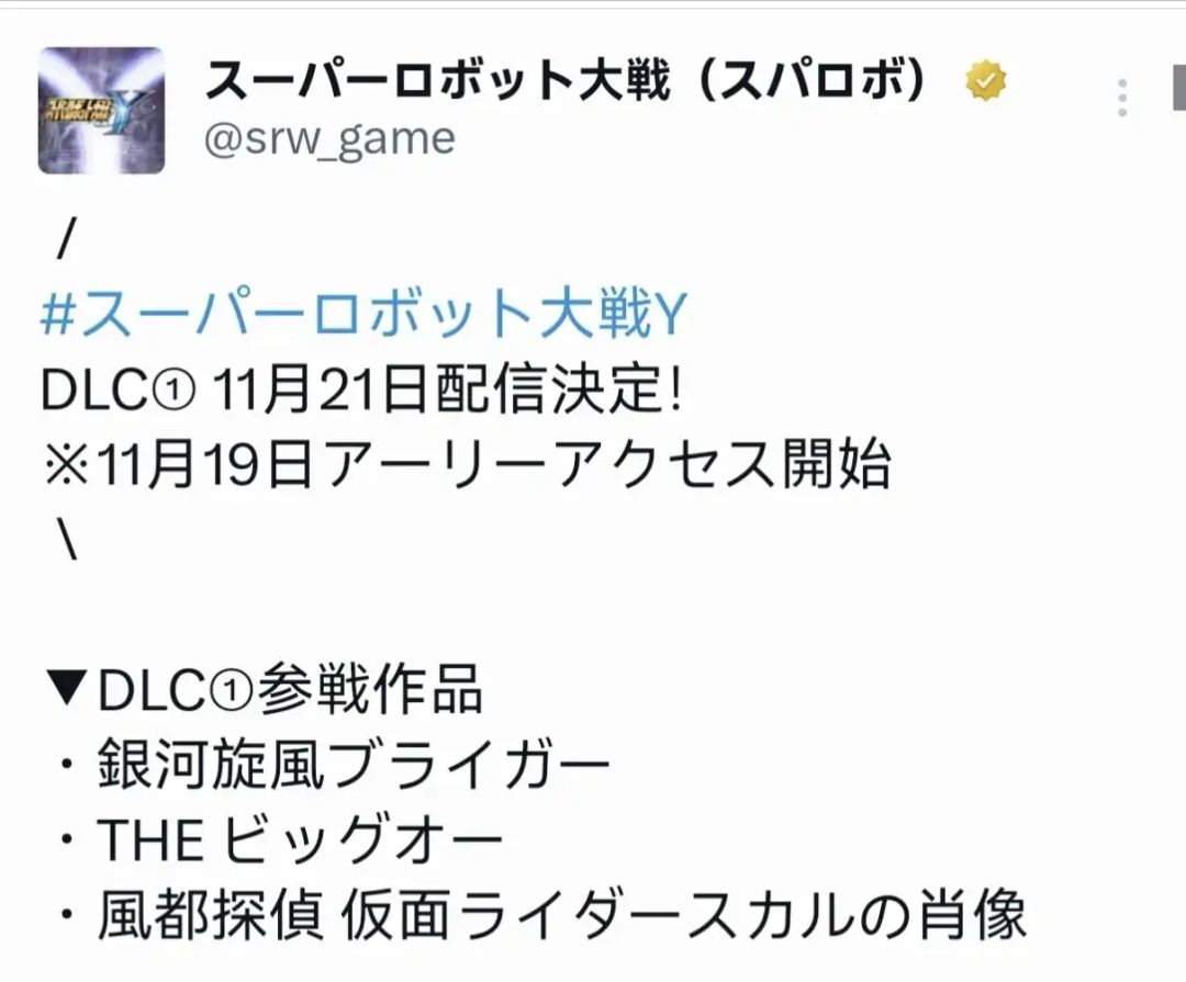 速报速报《超级机器人大战Y》DLC① 11月21日配信決定!※季票抢先体验提前2天,所以11月19日便可以开启游玩