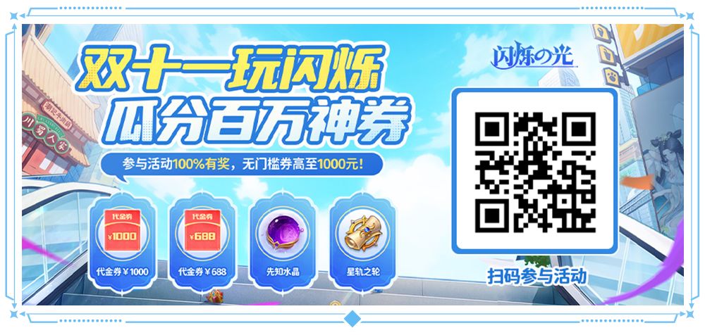 双11就玩闪烁之光,百万神券等你来瓜分!每日登录即可领取钻石、星轨之轮等豪华好礼!各类福利道具领不停,赶紧来参与吧!