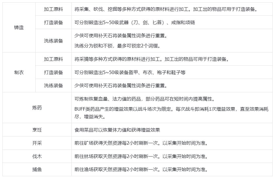 当少侠进入江湖即具备七种生活技能,而生活技能所需材料,一般为原材料、半加工材料。可用于铸造、制衣、烹饪、炼药等生活技能玩法。