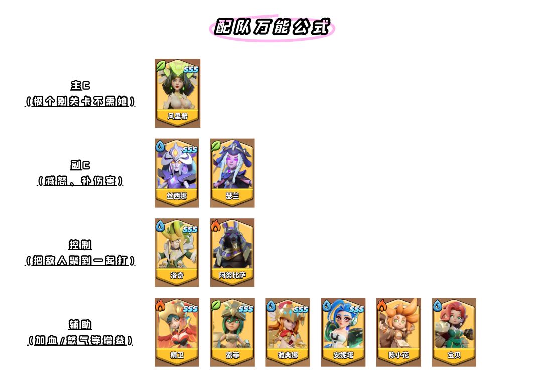 新版本配队:风里希、索菲、雅典娜(专30前用猴哥/安妮塔代替)、索纳尔(前期如果拍卖价格太高,可以底价拍一个牛大力代替)、小花(上位替代是克劳帕蒂/安妮塔)