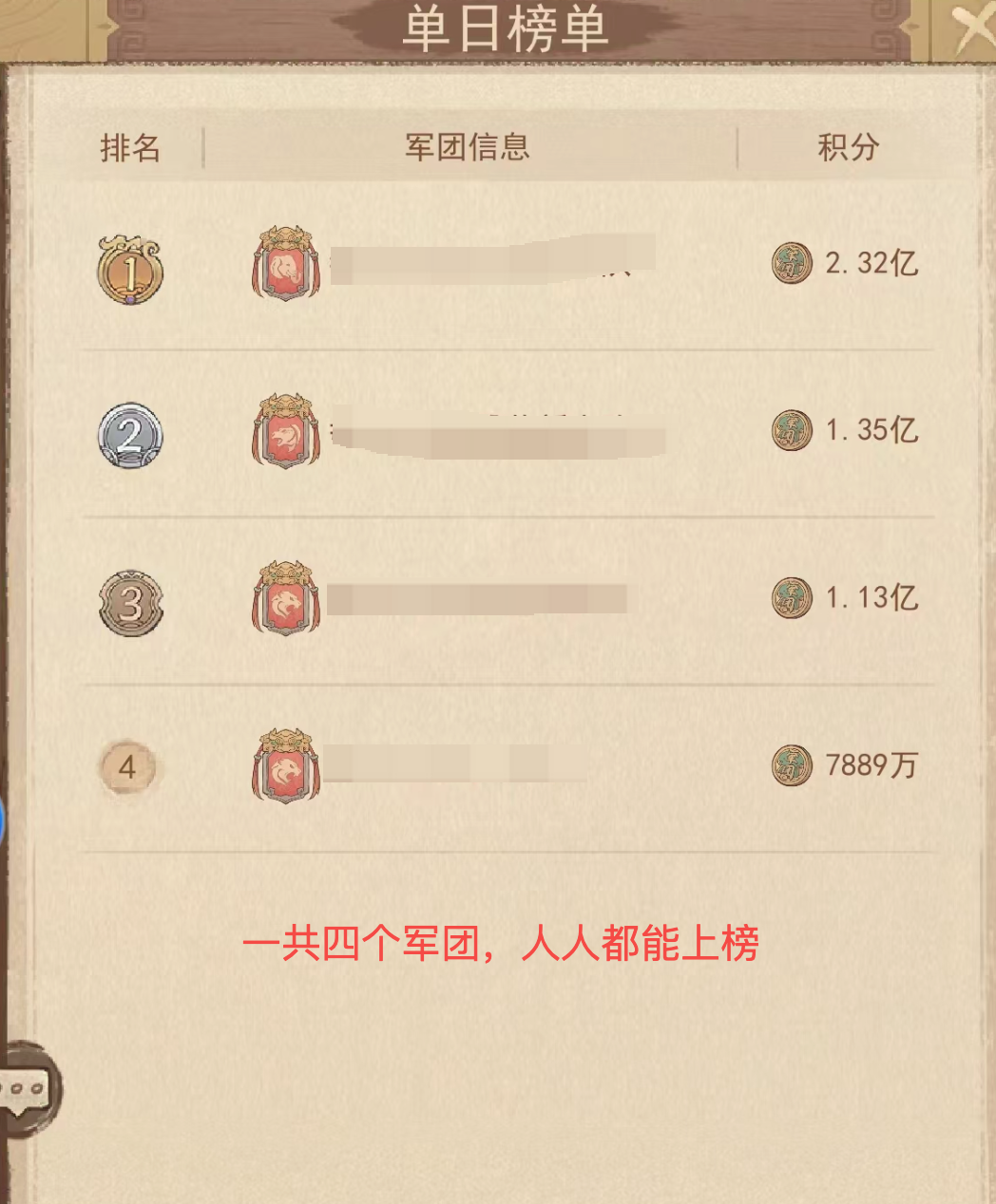 新的匹配机制下,一旦进入军团赛季,所有人员将被固定,期间无法退出或加入新成员。因此,战前组队的质量将直接决定整个赛季的走向。建议玩家们提前沟通,组建关系稳定、沟通顺畅的队伍,避免在系统自动整合阶段被随机分配,与不熟悉的团队甚至潜在的敌对势力合并,从而陷入被动。比如下图中,雄图大业第二天,第一名第二名的积分非常接近,谁第一谁第二往往就看是否能调动全体人员都上线进行军团讨伐。