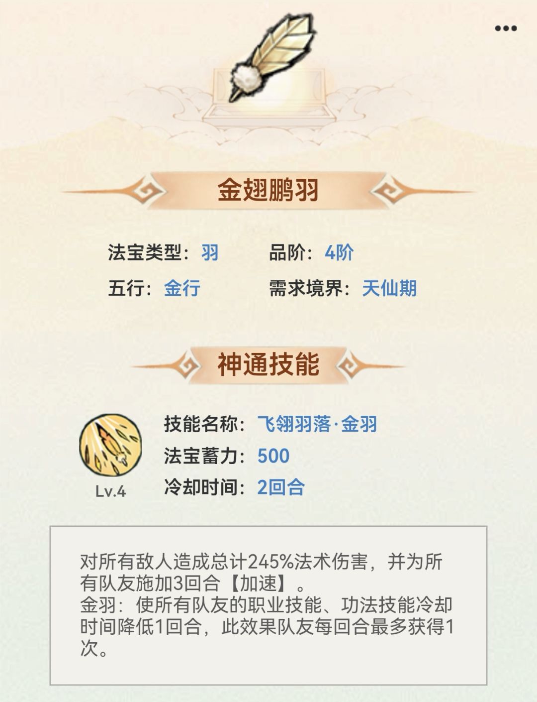 2. 飞翎羽落·金羽:对所有敌人造成总计245%法术伤害,并为所有队友施加3回合【加速】。