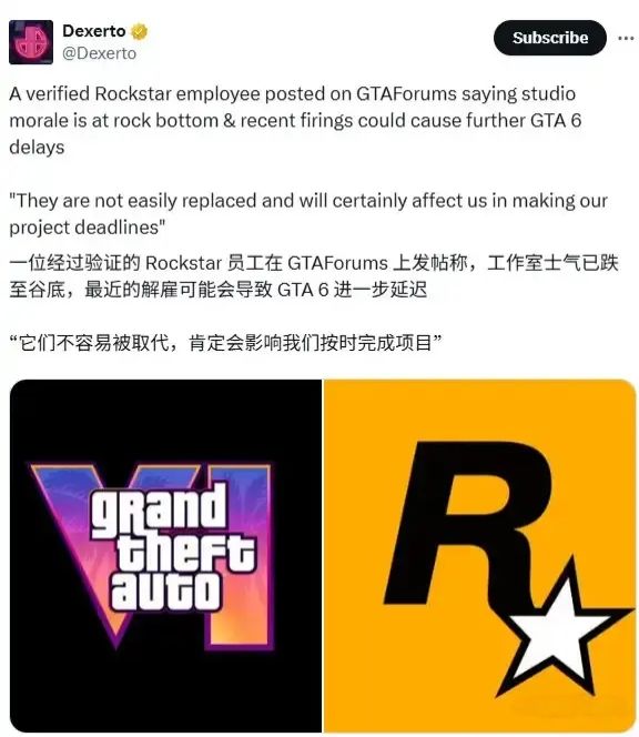 11月7日,R星官方宣布《GTA6》发售日第二次延期,从2026年5月26日推迟至同年11月19日,然而,与官方“打磨品质”的解释不同,一位认证为R星员工的用户在论坛发布长文,揭露跳票的真正原因,R星近期以“严重不当行为”为由解雇了34名核心员工,其中包括参与多代作品的资深开发者导致项目进度严重受阻,此次裁员被指意在打压工会化趋势,内部士气已跌至冰点![[TapTap表情|TapFamilyxdoro2_粉狗比心]](https://img-tc.tapimg.com/market/images/101c7e3200596fe8e03765080b467fb8.gif)