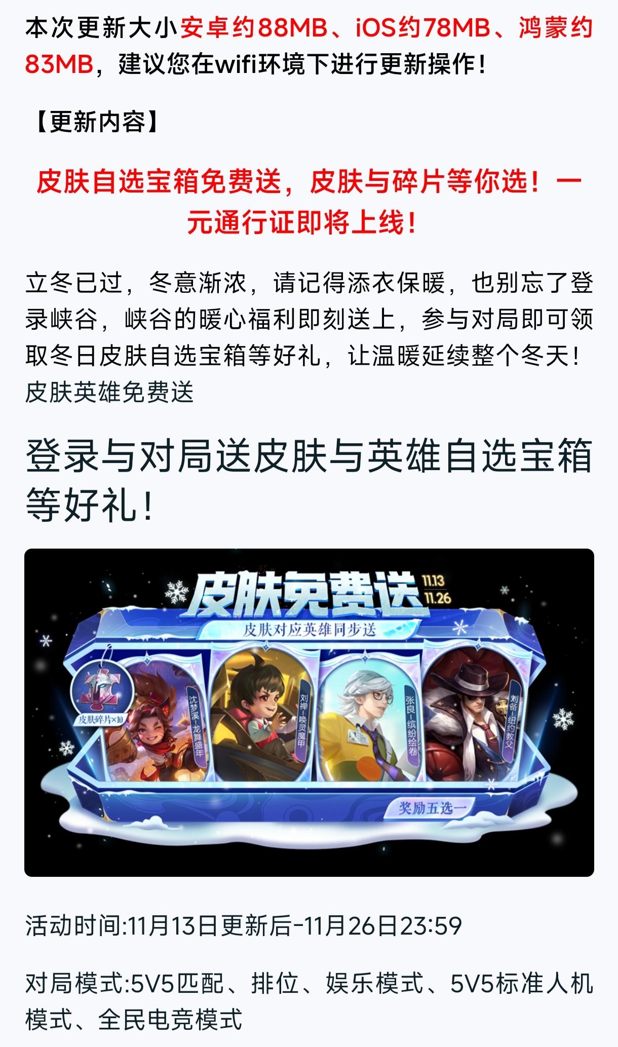 送皮肤与英雄自选礼包等好礼;一元通行证活动即