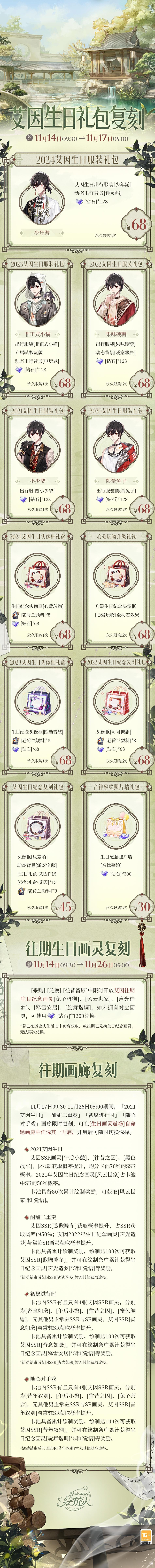 ★11月14日09:30 - 11月17日05:00,艾因往期多款生日服装礼包、头像框礼包返场,欢迎前往[采购]-[生日复刻]选购。