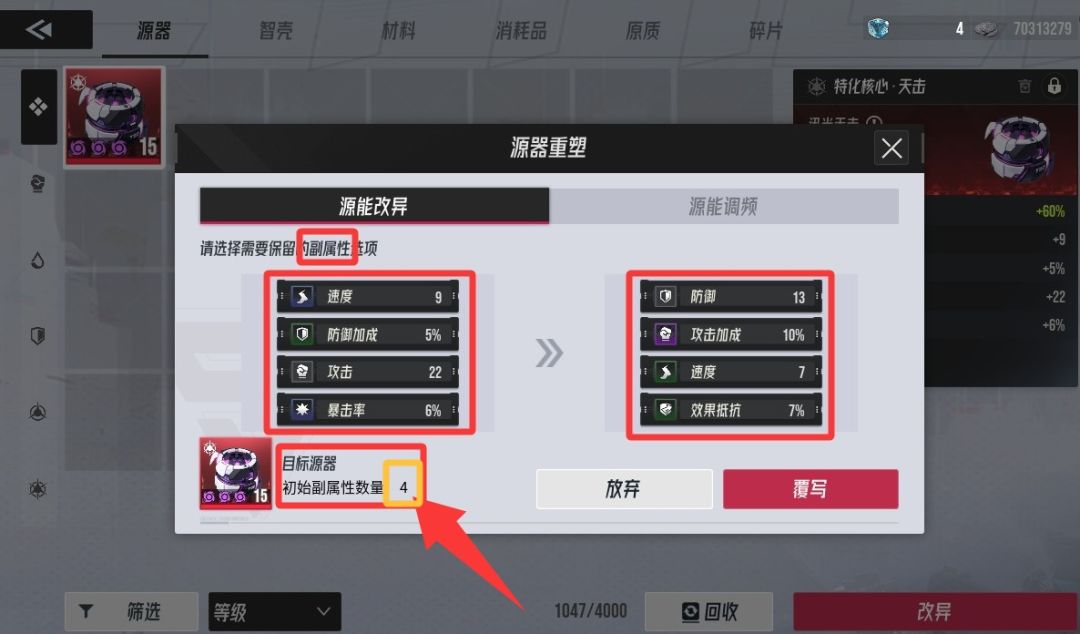 如下图所框选:系统会提示初始副属性的数量:4或者3 【一定要选择数量:4的】