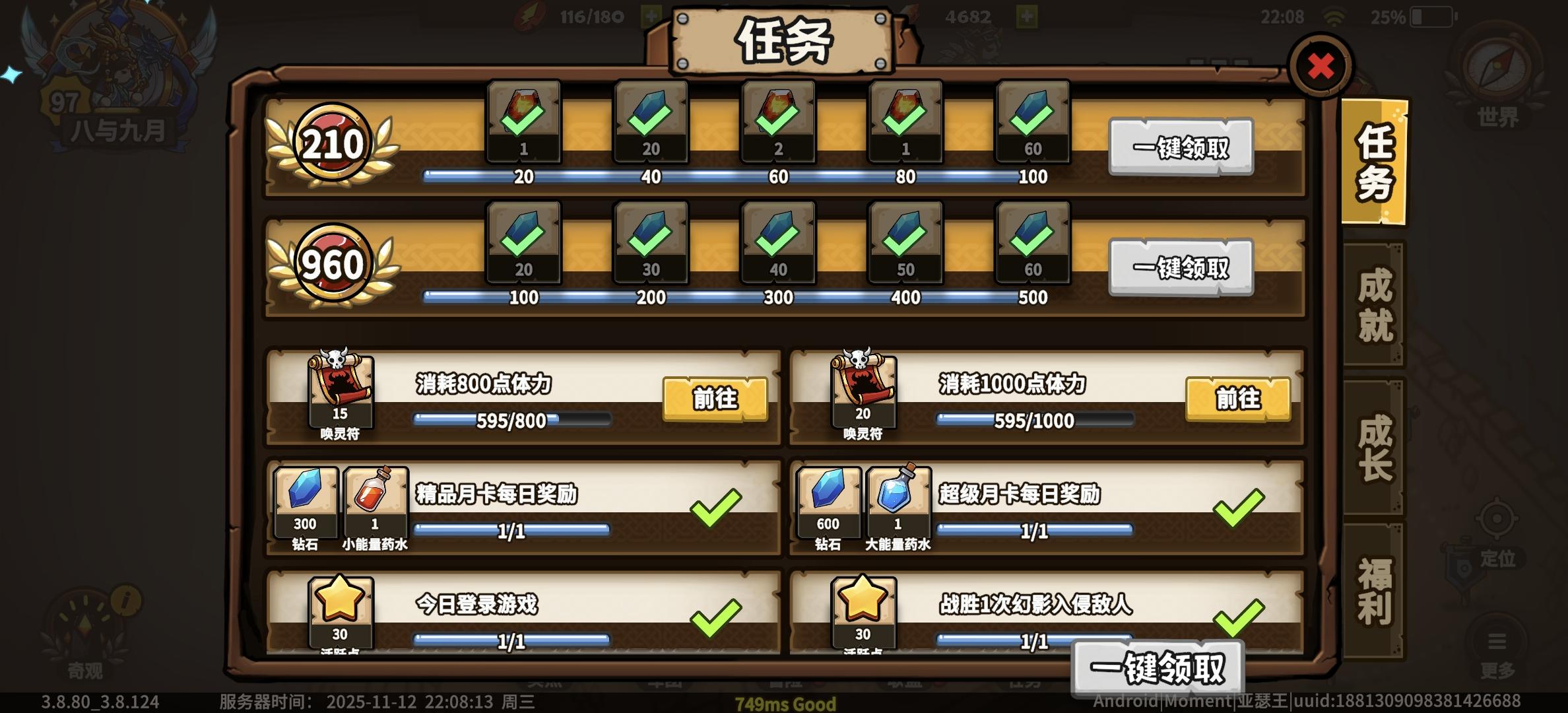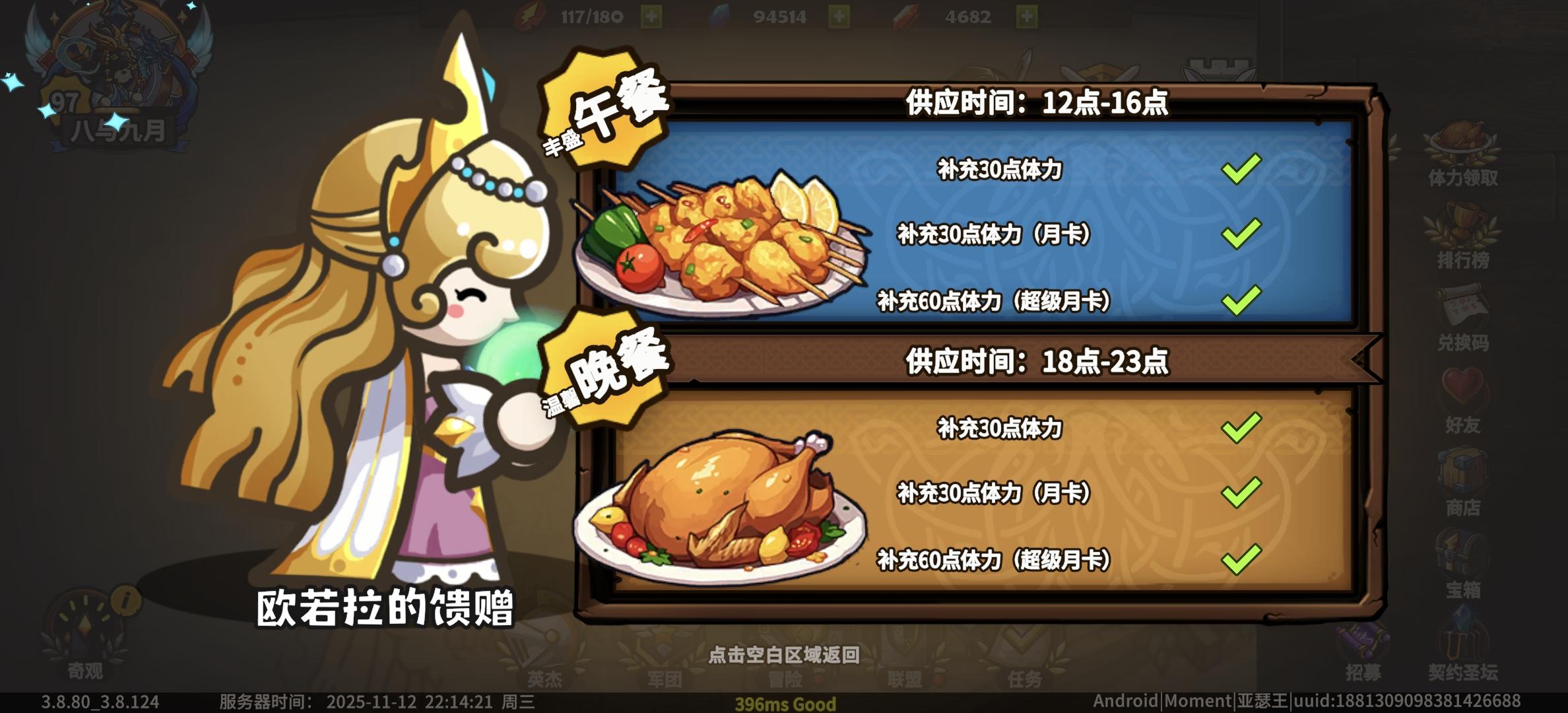 中午晚上领取体力