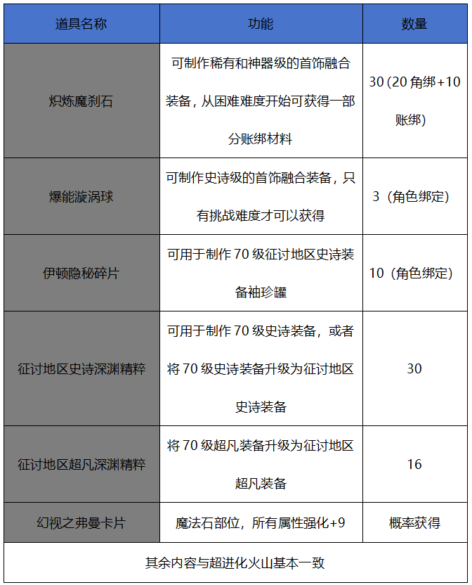 只不过是把防具贴膜制作材料换成了首饰贴膜制作材料,并额外添加了将原70级史诗超凡装备升级成新版的材料,以及15倍的新版深渊奖励,剩下的奖励内容都与“超进化火山带”完全相同,下面看看其他设定