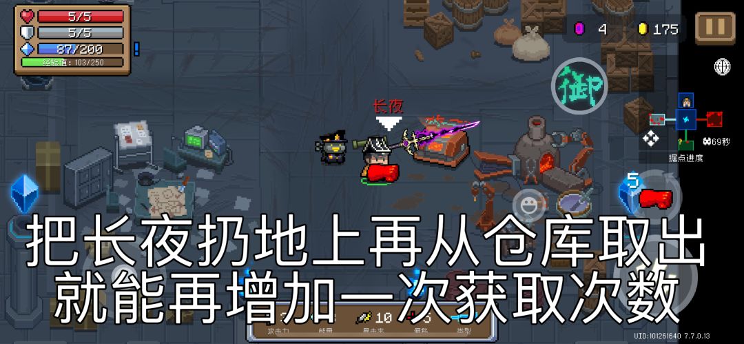 4.带着长夜进古代传送门。兑换机处捡起武器可以得到一次获取次数,带进守护神殿模式再捡一次可以额外得到一次获取次数。再次捡起后就可以结算存档了,记得要马上存档哦。